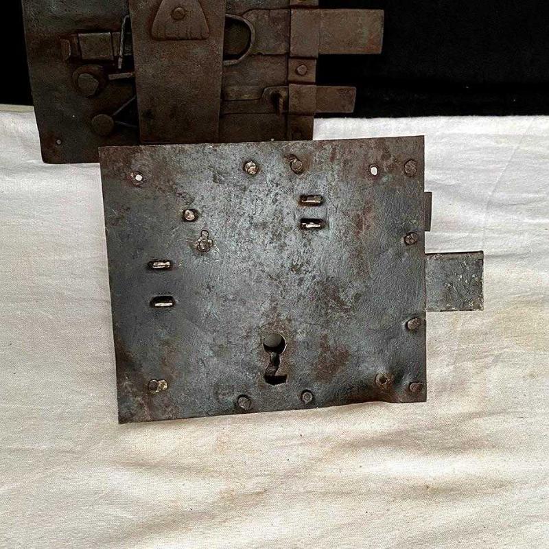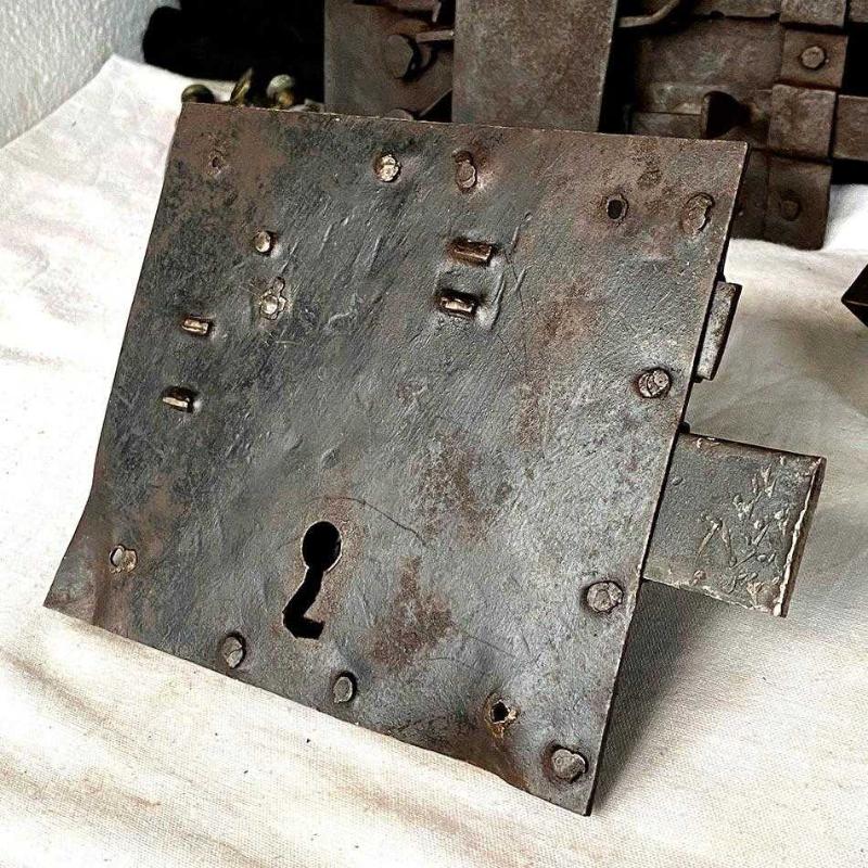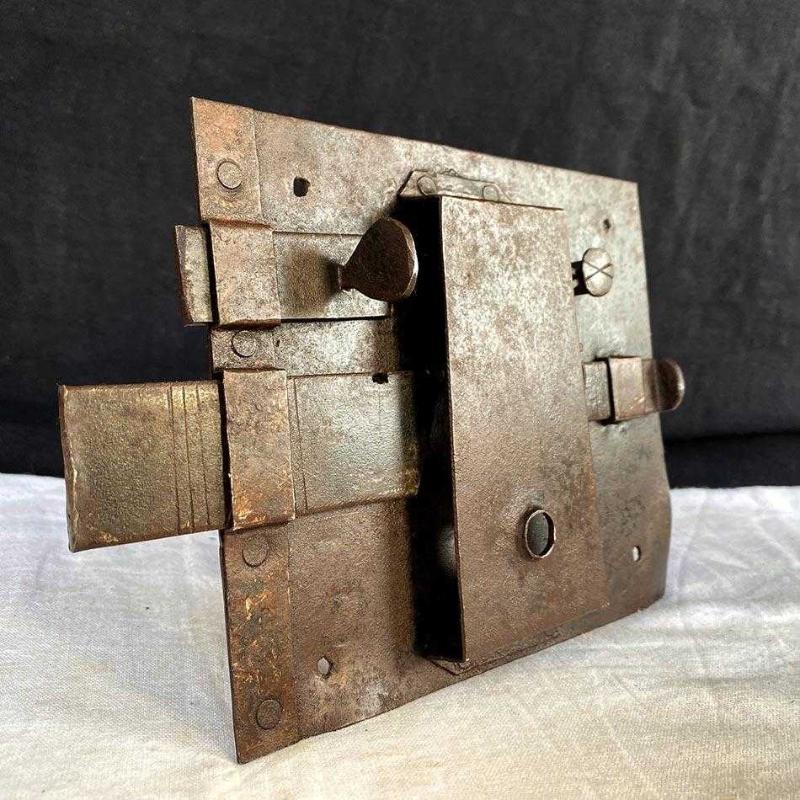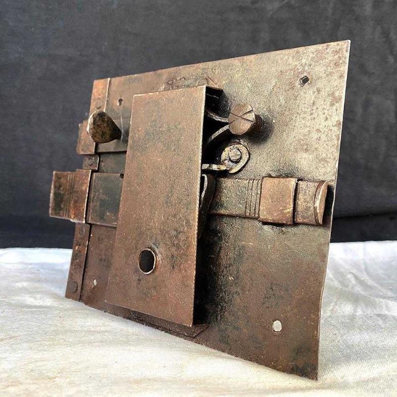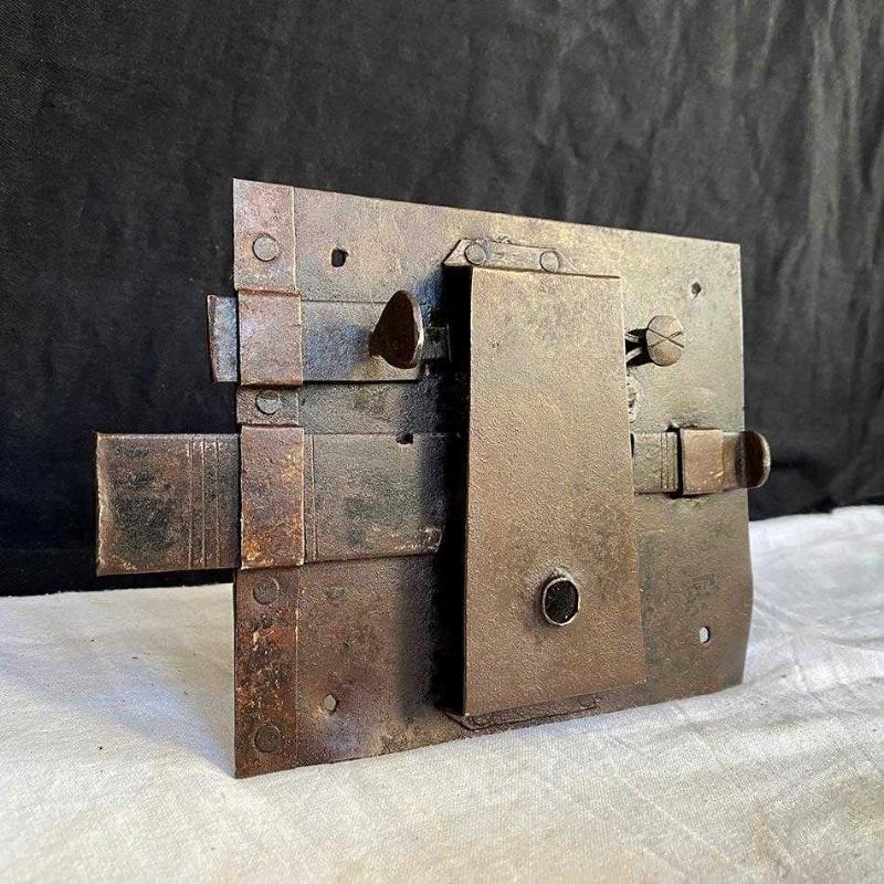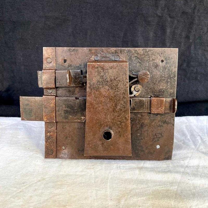 Geçtiğimiz yüzyıldan harika bir dövme demir sürgülü kilit. Tamamen el işçiliğiyle dövülmüş demirden üretilen bu "Rim Lock" (Yüzey Monteli Kilit), dekoratif demir aksesuar meraklıları için nadir bir objedir. Kilidin biri ufak diğeri daha büyük iki adet sürgüsü bulunuyor. Kilidin ön yüzünde sade bir anahtar yuvası, arka yüzünde biri ufak diğeri büyük iki adet sürgü, yay ve perçin sistemleri bulunuyor. Kilit, yüzeyindeki doğal pas patinası, dövme izi ve perçin detayıyla benzersiz bir endüstriyel ve Rustik tarz dekoratif aksesuardır. Ürün Tipi: Rim Lock / Surface Mounted Lock (Yüzey Monteli Kilit) Dönem: Geç 18. Yüzyıl-Erken 19. Yüzyıl (Geç Osmanlı Dönemi) Malzeme: Geleneksel Dövme Demir Teknik Detay: Sürgülü, el yapımı perçinleme Kullanım Alanı: İç mekan kapıları, antika sandıklar, koleksiyon sergisi. Dekor Stil: Endüstriyel, Rustik, Mimari Antika. 13x19 cm 450 gr