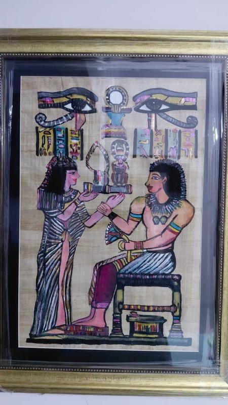 Zamanın kumları arasından günümüze ulaşan bu etkileyici eser, Antik Mısır’ın kutsal anlatı geleneğini yansıtan papirüs üzerine el boyaması özgün bir çalışmadır. Kompozisyonun merkezinde, tahtında oturan güçlü figür ile ona adanmış sunuyu takdim eden kadın figürü yer alır. Bu sahne; sadakat, bereket ve ilahi düzenin sembolik bir anlatımıdır. Üst bölümde yer alan Horus’un Gözü, eserin koruyucu ruhunu temsil eder. Antik Mısır’da bu sembol; bilgelik, şifa ve ilahi gözetim anlamına gelir. Etrafındaki hiyeroglif detaylar ve renkli semboller, eserin spiritüel derinliğini güçlendirirken izleyiciyi binlerce yıl öncesinin inanç dünyasına davet eder. Doğal papirüs dokusu üzerinde kullanılan canlı renkler ve siyah kontur çizgiler, geleneksel Mısır sanatına sadık kalınarak işlenmiştir. Çerçeveli haliyle koleksiyonluk bir parça olup; antikacılar, koleksiyonerler ve mistik sanat severler için özel bir eserdir. Bu eser yalnızca bir duvar süsü değil; geçmişin bilgeliğini, kutsal ritüellerini ve zamansız estetiğini taşıyan bir anlatıdır.