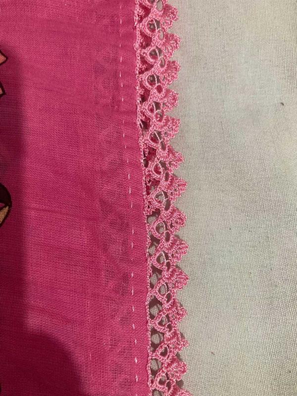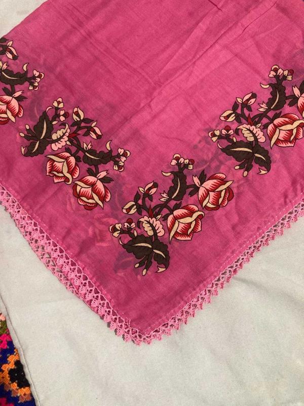 embe zemin üzerine çiçek desenli tülbent, kenarları el emeği tığ oyası ile işlenmiştir. 90’lı yılların sevilen modellerindendir. 📏 Ölçü: 87 cm (bir kenar) 🪡 Oya: El yapımı tığ oyası 🎀 Durum: Temiz ve iyi kondisyonda Nostaljik tekstil koleksiyonu yapanlar, sandık kültürüne ilgi duyanlar ve çeyizlik parça arayanlar için değerlendirilebilir. El emeği ve dönem ruhunu yansıtan zarif bir örnektir.