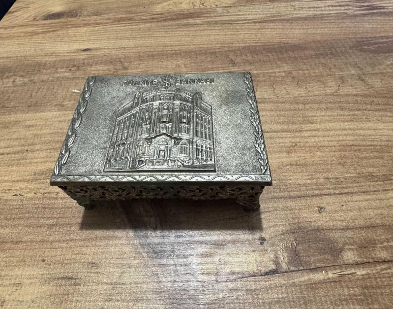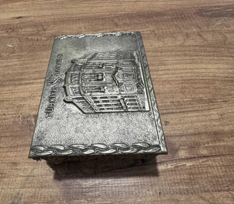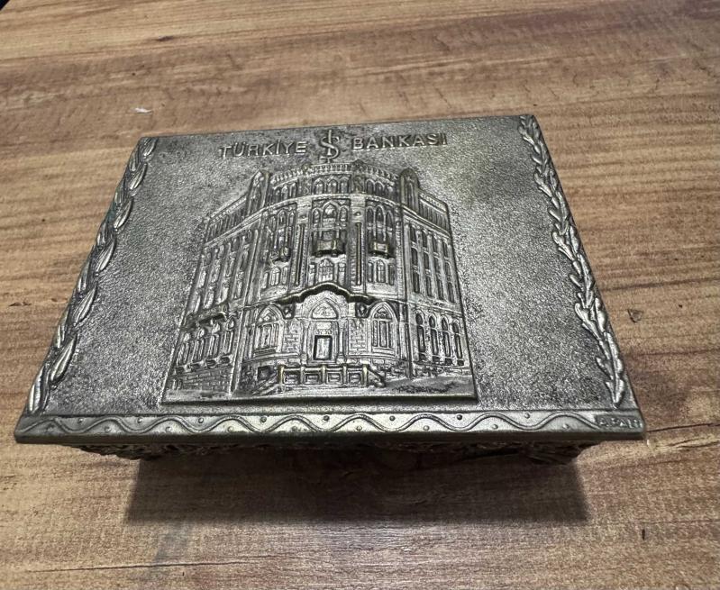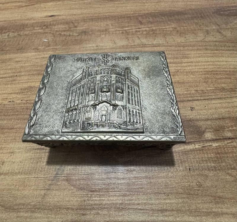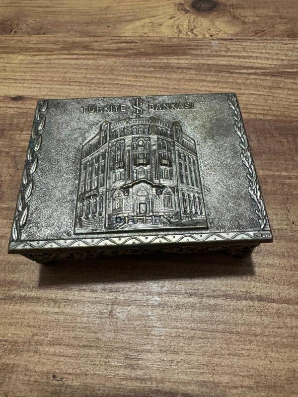 Antika 1970’li yıllara ait, Türkiye İş Bankası'nın Ankara Ulus’taki meşhur tarihi genel müdürlük binasının (Mimar Giulio Mongeri eseri) yüksek kabartma görselini taşıyan nadir bir dönem objesidir.Takı aksesuar Kutusu