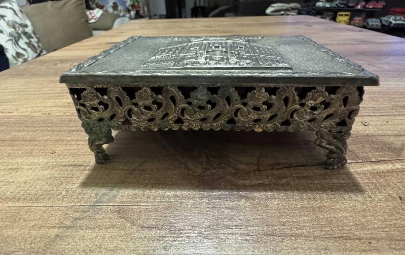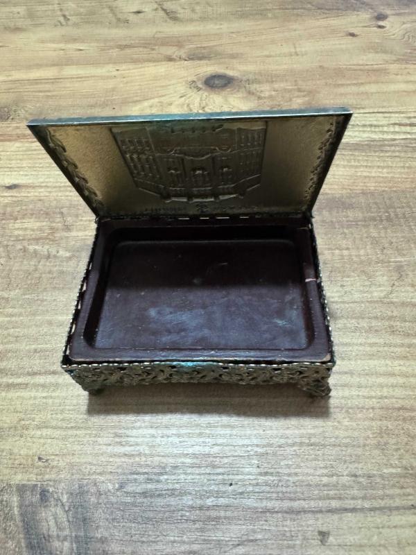 Antika 1970’li yıllara ait, Türkiye İş Bankası'nın Ankara Ulus’taki meşhur tarihi genel müdürlük binasının (Mimar Giulio Mongeri eseri) yüksek kabartma görselini taşıyan nadir bir dönem objesidir.Takı aksesuar Kutusu başlıklı antika/koleksiyon objesi Türkiye menşe’lidir. Objenin ait olduğu dönem bilinmeketedir.