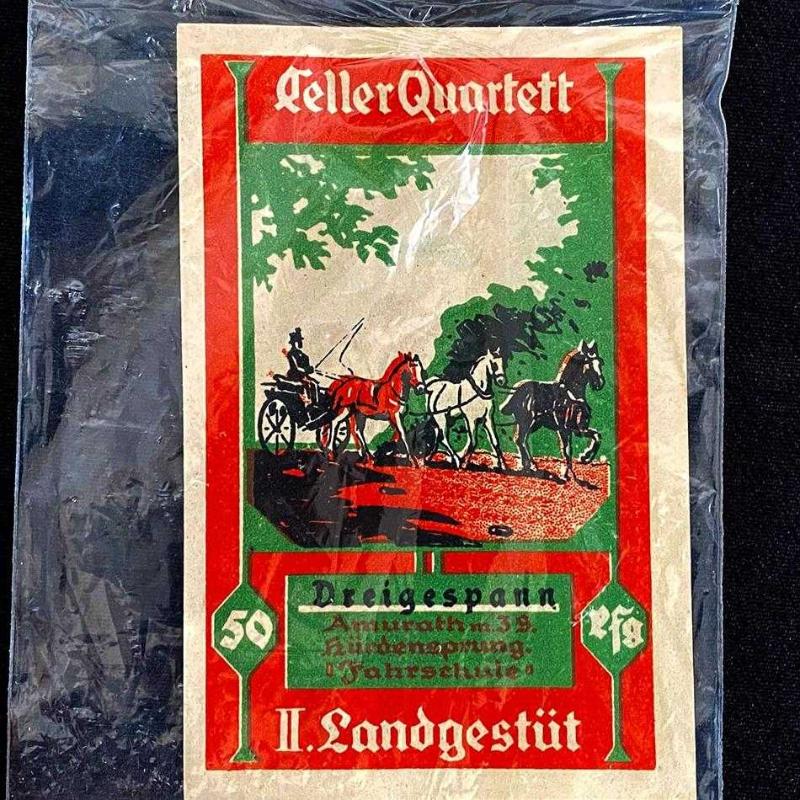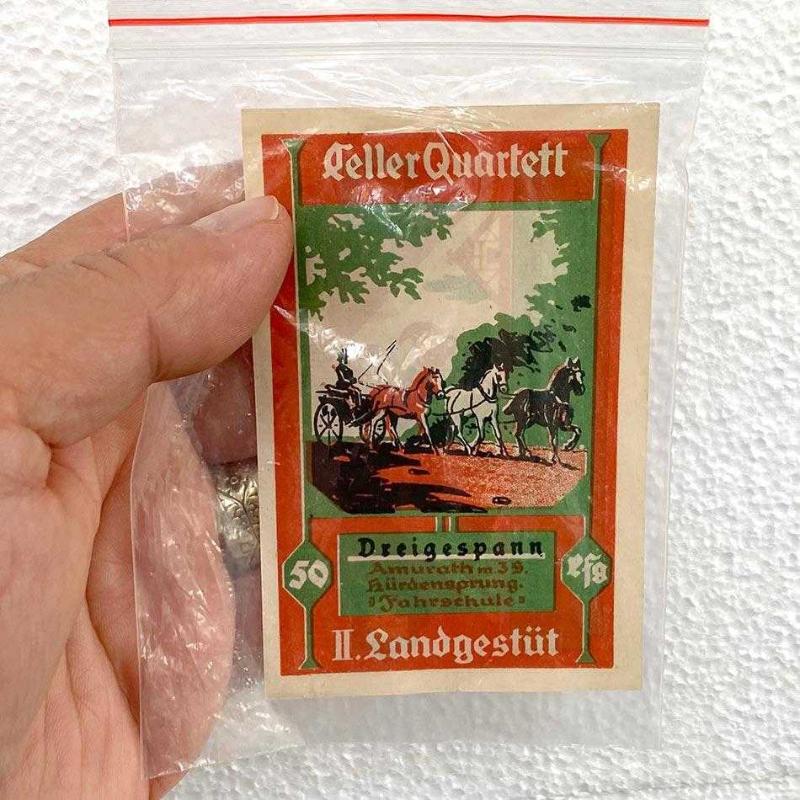 Oldukça eskilerden, Alman Celle şehrine ait 50 penilik kupon kağıdı. Bu kağıtların bir yüzünde tarihi/dini konulu bir resim, diğer yüzünde ise bazen indirim bazen de reklam duyuruları olurdu. Kağıtta kuponun kullanım bilgileri yer alıyor ve 31 Ocak 1922 tarihinde geçerliliğini yitirecek uyarısı yer alıyor. Fayton resmi olan yüzünde 50 peni değeri ve at yetiştiriciliğiyle ünlü Celle bölgesi (Devlet Atçılık Çiftliği) reklamı yer alıyor. Kağıt yaşına göre iyi durumdadır, ışık görmeyecek şekilde ve hava geçirmez plastik torbada özenle muhafaz edilmiştir. Basım: J. Mindy Matbaası, Paris 6.5 x 9.5 cm