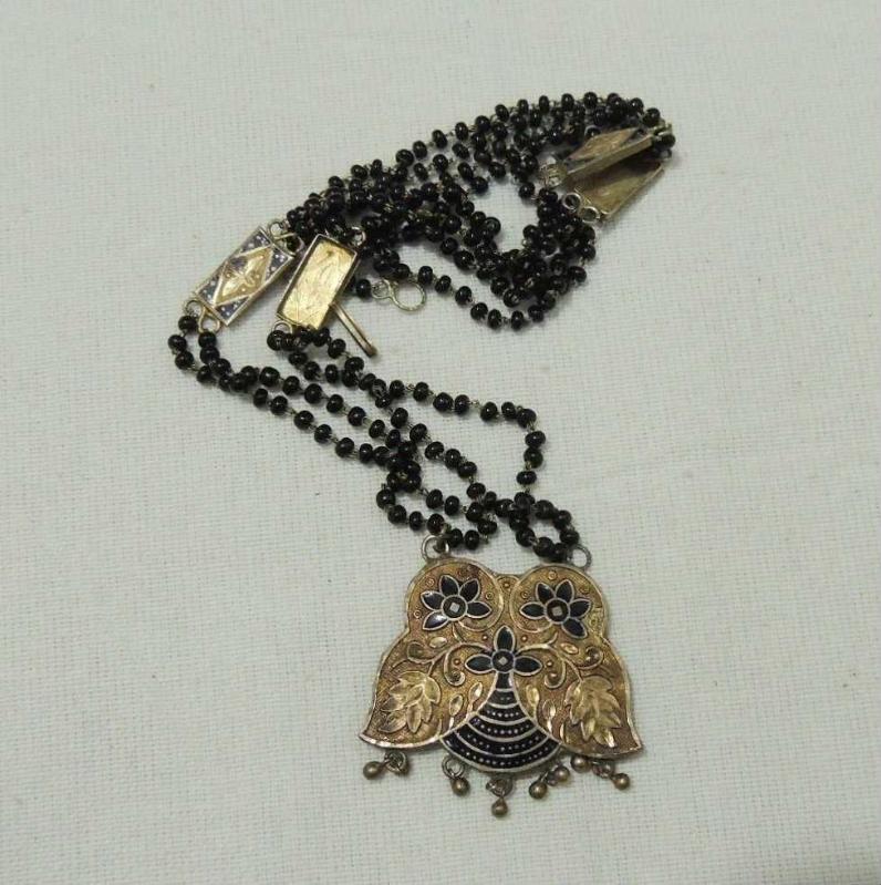 Kolye uzunluk 63cm. Damga Yok ama metal test edildi ve en az 900 ayar gümüş olduğunu garantiliyoruz.. Altın vermeyli gümüş üzerine siyahn mine çalışılmış.Büyük ihtimalle Hindistan menşeili.Kondisyonu çok iyi. 0001 *Ürünler %100 Orijinaldir.! *Yukarıda anlatımı yapılan ürünü satın almadan önce aklınıza takılan soruları hiç çekinmeden sorabilirsiniz.En kısa zamanda seve seve cevap veririz. *Sattığımız ürünlerin hepsi tarafımızdan garantilidir.Herhangi bir hasar veya kusur durumunda Kargo Görevlisine tutanak tutturarak İade etme garantisi vardır. *Hijyen nedeniyle İadesi yapılamayan ürünler şunlardır; ----Kozmetik ürünleri (Krem, losyon, parfüm, makyaj malzemeleri,vs) ----Mayolar ,İç Çamaşırları ve Giyim Eşyaları. *Kullanılmış, Vintage veya Antika olarak belirttiğimiz ürünler hiçbir zaman SIFIR ürün kondisyonunda değildir ve olmaları da beklenemez. Bu tip ürünlerin kondisyon detayı tarafımızdan ayrıntılı olarak verilecek ve mümkün olduğunca çok resimlenecektir.Vintage ve Antika ürünler,son 20 yıl içinde Amerika nın çeşitli Eyaletlerinde Antika evlerinden, Müzayede evlerinden veya Estate Sale olarak geçen Satış yerlerinden alınmıştır ve kendi özel kolleksiyonumuzdandır. *Patinasını kaybetmemesi için hiçbir antika ürünü temizlemiyoruz. *Alıcılar bizden ürün alırken bu şartları kabul etmiş demektir.! HAPPY BIDDING...! İYİ ALIŞVERİŞLER!!! ?