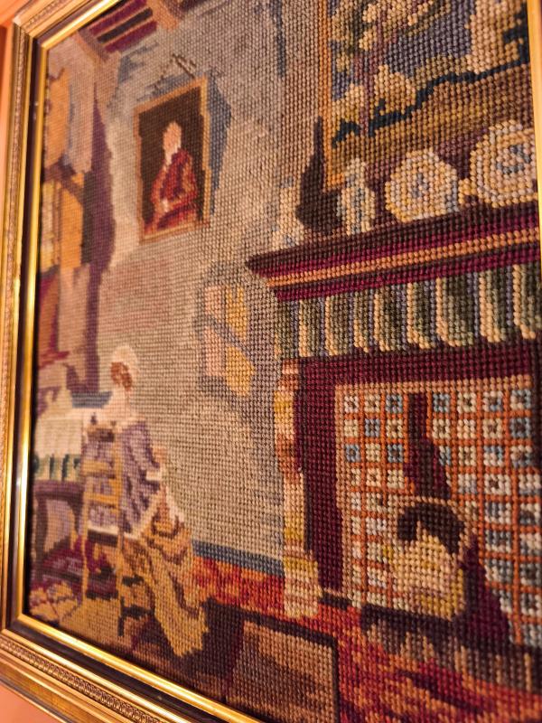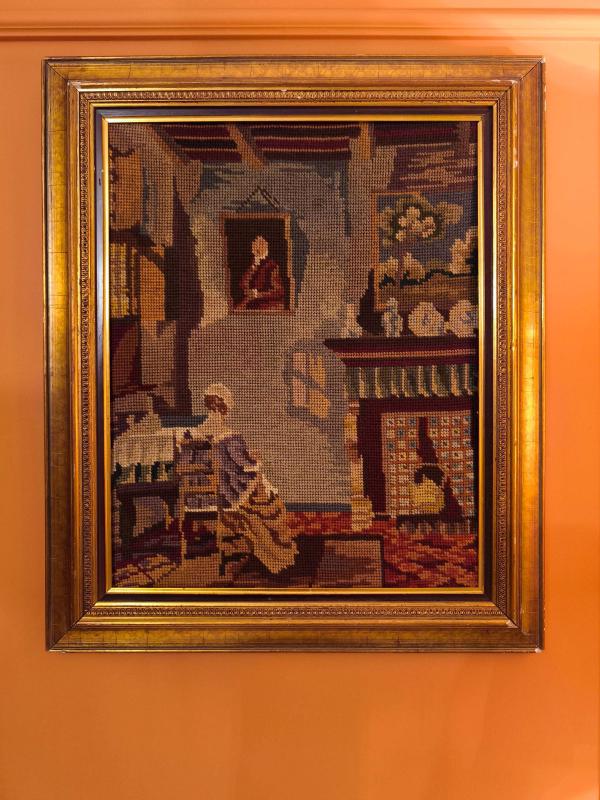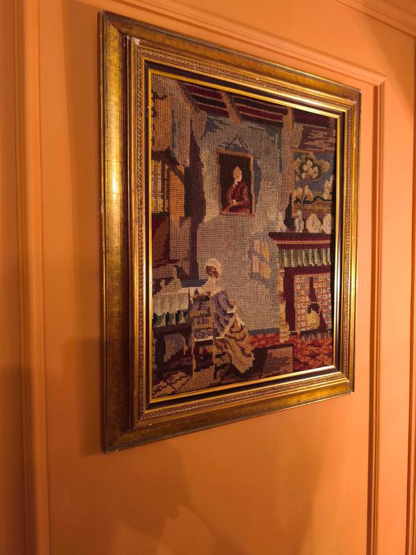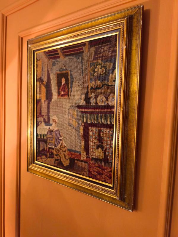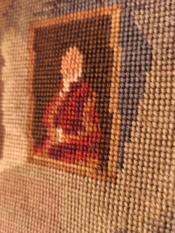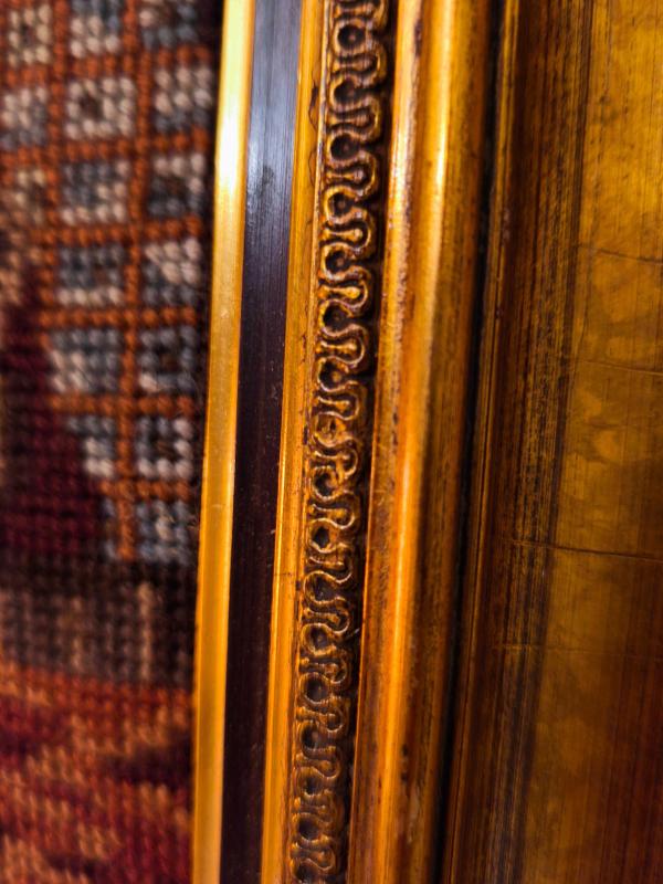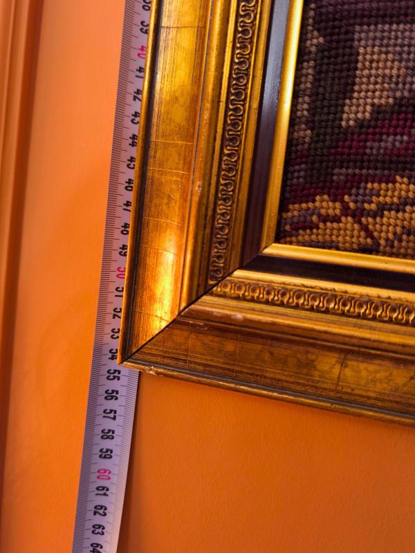 Ahşap el oyma çerçevesinde komple el işi goblen tablo. Çok şık, yaşlı, dinç ve havalı. uyguna . 46x55 cm