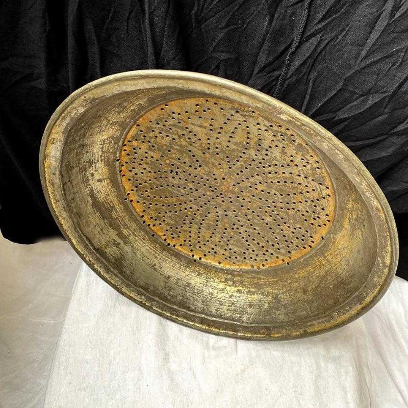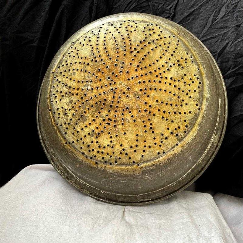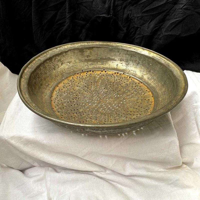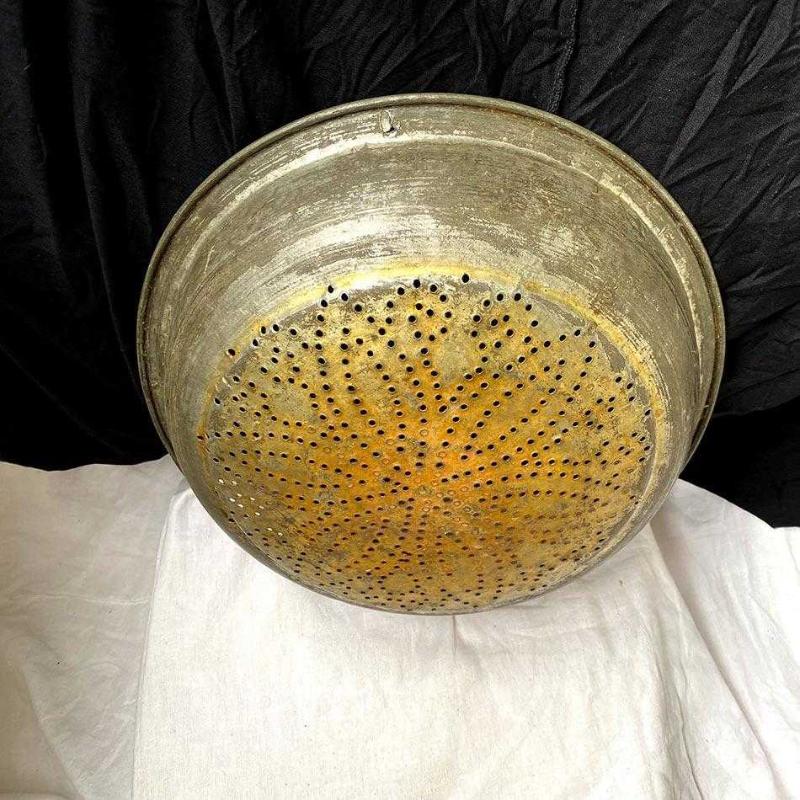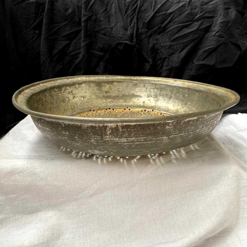 Bir zamanların mutfağın vazgeçilmez eşyalarından, 1970'lerden nadir bir bakır kevgir. Geleneksel el yapımı bakır mutfak eşyalarının nadir örneği olan kevgir, 29 cm çapı ve yarım kilo ağırlığıyla harika bir dekoratif metal eşyadır. Kevgir yaşına göre çok iyi durumdadır, herhangi bir kırık, çatlak yoktur. Yükseklik: 7 cm Çap: 29 cm 550 gr