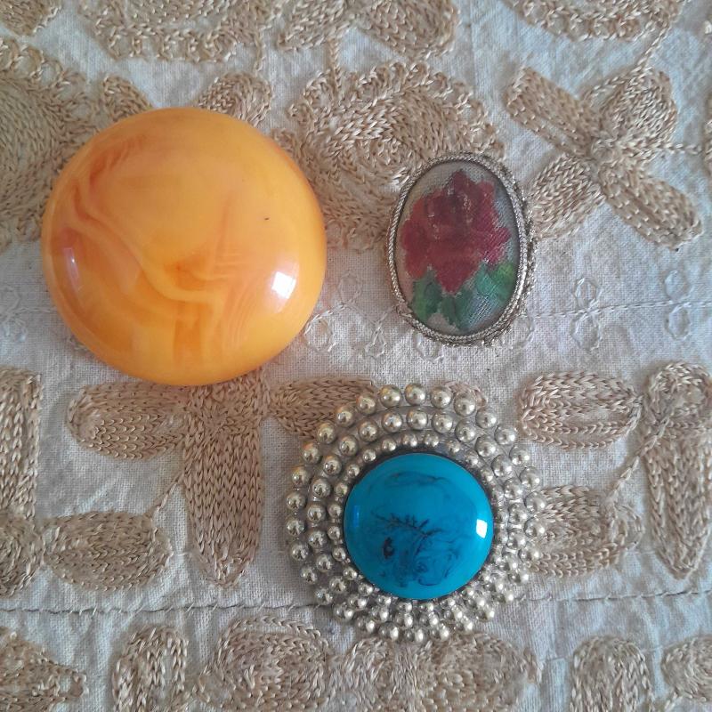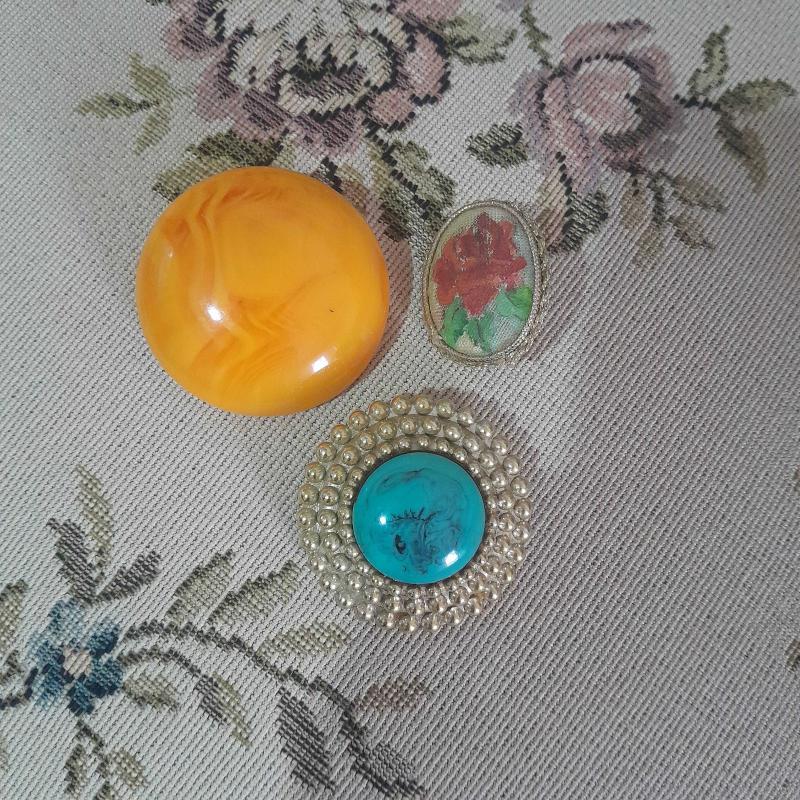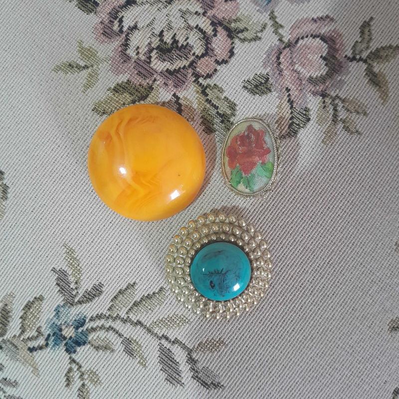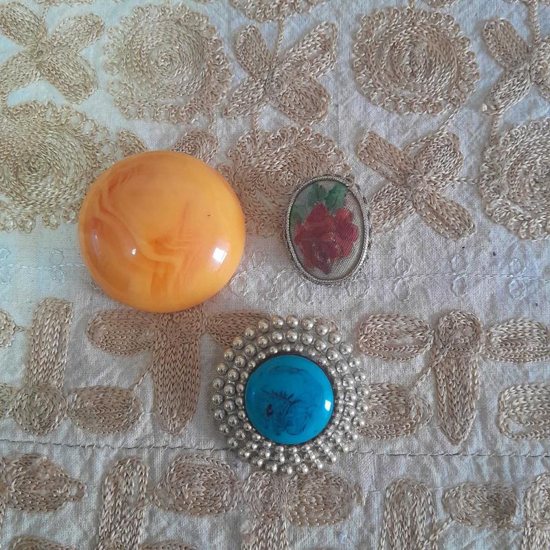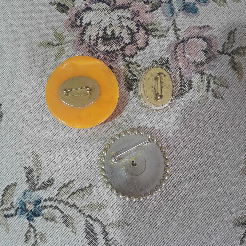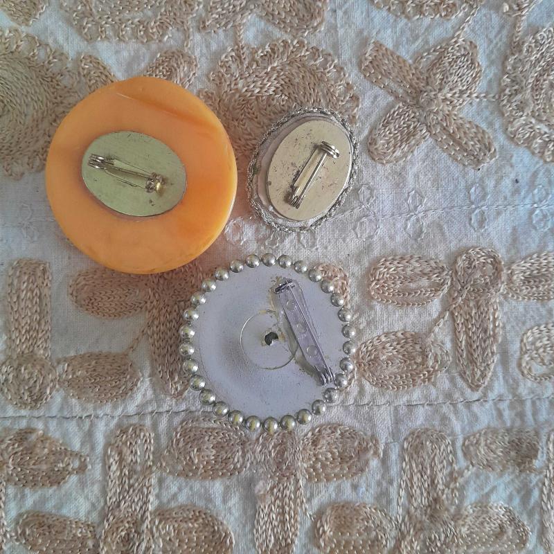 Üç adet antika broş olup çok eski dönemdir.Sarı renk olanın arka kısmında hafif bombey bulunur. Takma yerleri sağlamdir.