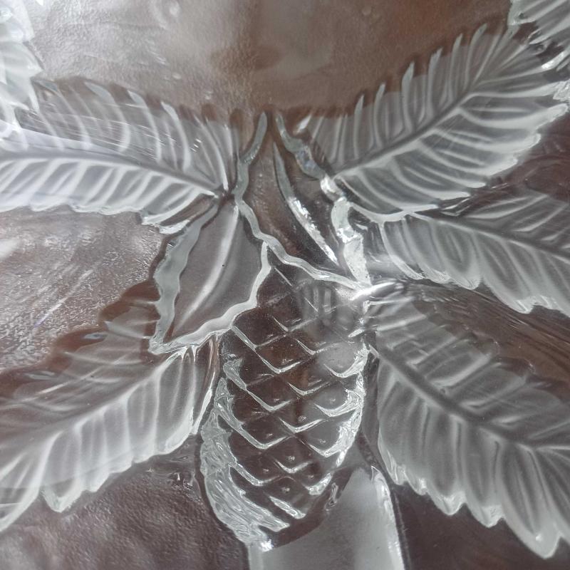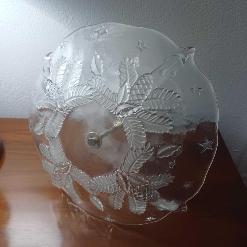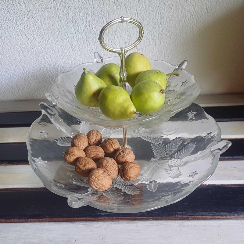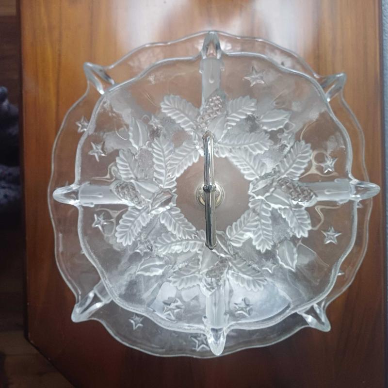 Iki katli.Dokme cam.Seffaf ve opak cam birarada kullanilmis. Kabartma ananas ve yildiz rolyefli. Metal (gumus DEGIL) aparatli. Oldukca kalin bir camdan mamul. Herhangibir damga yok. Ancak Avrupa malı (kendim aldim Finlandiya'dan) Tahmini en erken 1970 'ler. Cam tabaklar cukur formda yani derin,epey birsey alabilir. Ve her katmanda 4 adet hafif sivrilen detaylar var. Urun vintage ve kullanilmis. Boyle cevizleri,meyveleri koydugumuz,mutfagimizin orta yerinde kullanilan bir tabak.Yani kullanima dair izlere rastlamaniz mumkun ancak fotograflayabilinecek spesifik bir iz,hasar,kusur YOK. Metal kisimin kaplamasinda hafif atiklar var(fotolarda goruldugu gibi) Oldukca agir,oyle dokunsan dusecek sunumluklardan degil. Velhasil kelam şahane bir cam sunumluk. Umuyorum ki siz de begenirsiniz... Alt cap 35 cm Ust cap 23 cm Yukseklik 27 cm.