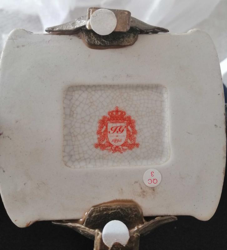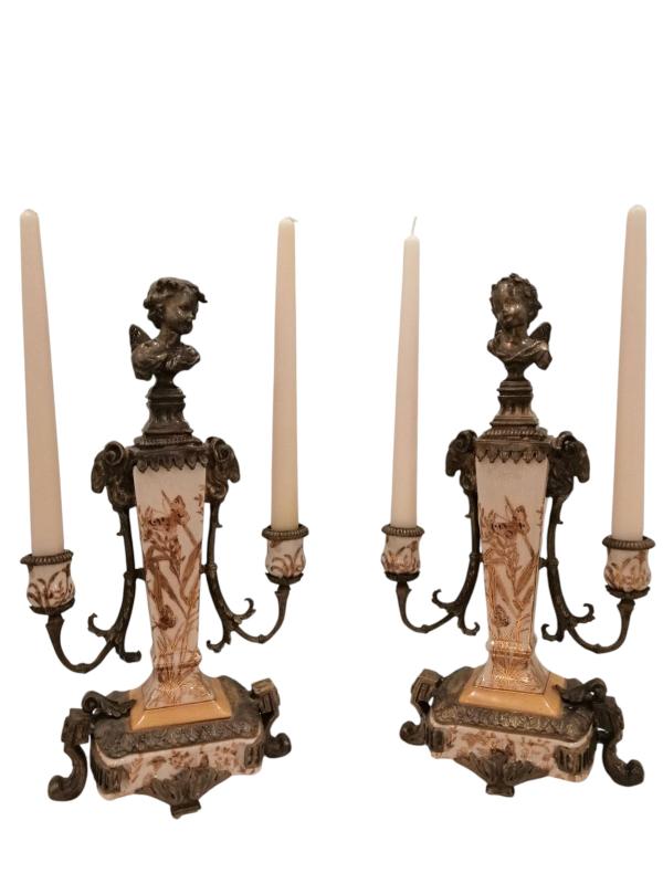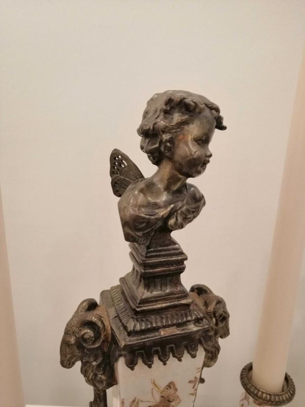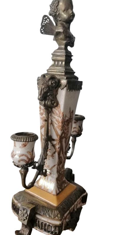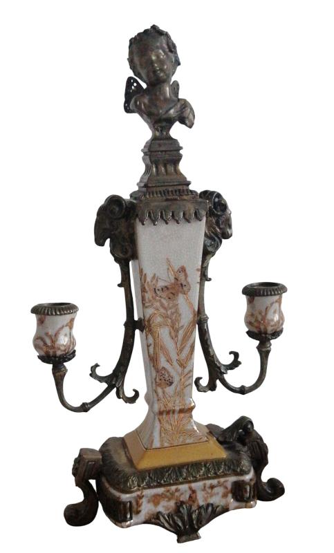 1895 damgalı İngiltere menşeili seramik üzeri el boyama detaylı melek ve hayvan figürleriyle antika şamdan
