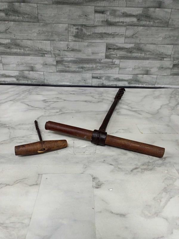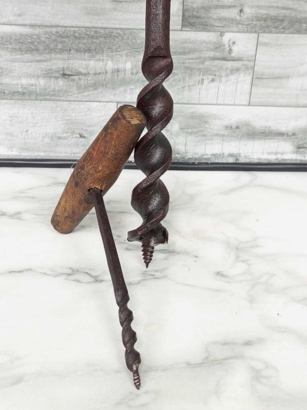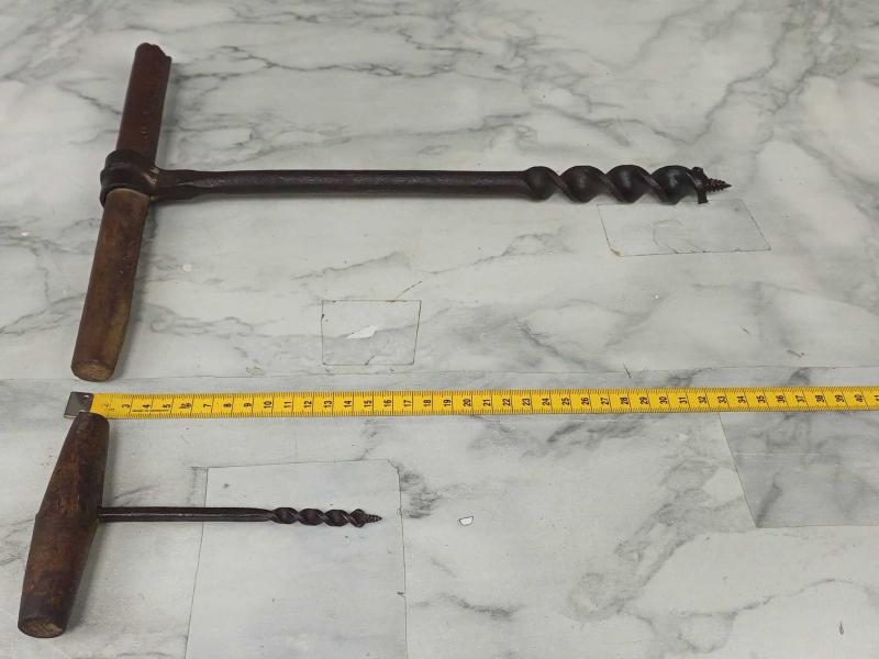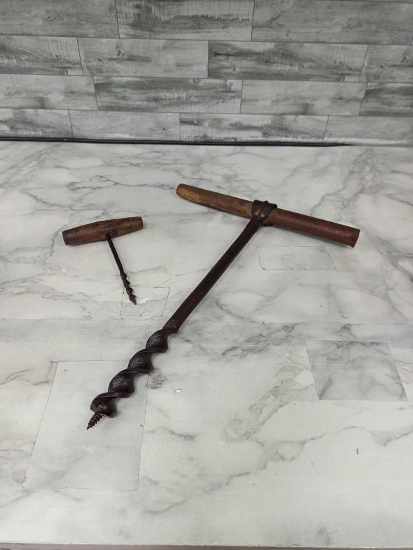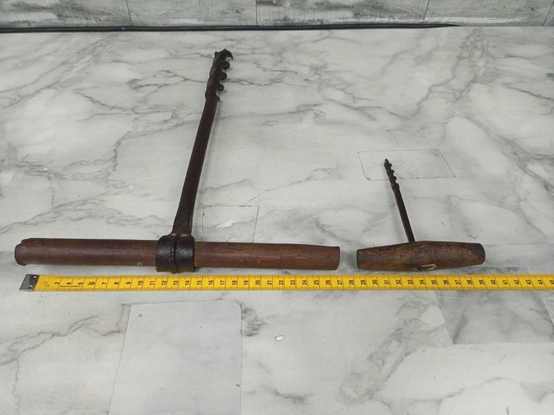 Koleksiyonluk değer taşıyan, tamamen el işçiliği ile dövme demirden imal edilmiş iki farklı boyda antika el burgusu (matkap). Ahşap sapları ve karakteristik helezon yapısıyla hem dekoratif hem de işlevsel bir settir. Ürün Detayları ve Kondisyon: Malzeme: Dövme demir gövde, orijinal masif ahşap T-saplar. İşçilik: Burgu uçları "kalem işi" formunda, geleneksel yöntemlerle elde verilmiş kıvrımlara sahiptir. Kondisyon: Demir kısımları zamanın verdiği doğal patina ile kaplanmış olup oldukça sağlamdır. Ahşap saplarda çatlak bulunmamakta, ele tam oturmaktadır. Kullanıma uygun kondisyondadır. Kullanım Alanları: Koleksiyon: Marangozluk aletleri ve etnografik obje koleksiyoneri için idealdir. Dekorasyon: Restoran, kafe veya rustik tarzdaki atölyeler için mükemmel bir duvar objesidir. Zanaat: Geleneksel ahşap işçiliği ile uğraşanlar için elektrik gerektirmeyen, nostaljik ve etkili bir el aletidir. Not: Ürünler fotoğraflarda görüldüğü gibi set olarak (2 adet) gönderilecektir. Kondisyonu ve yaş itibarıyla nadir bulunan temizliktedir.