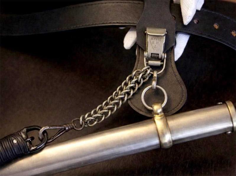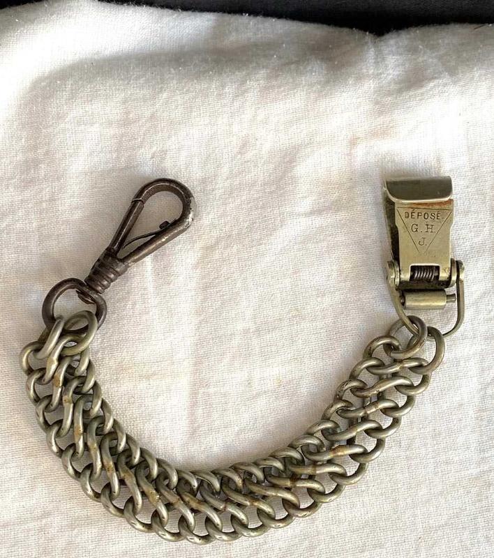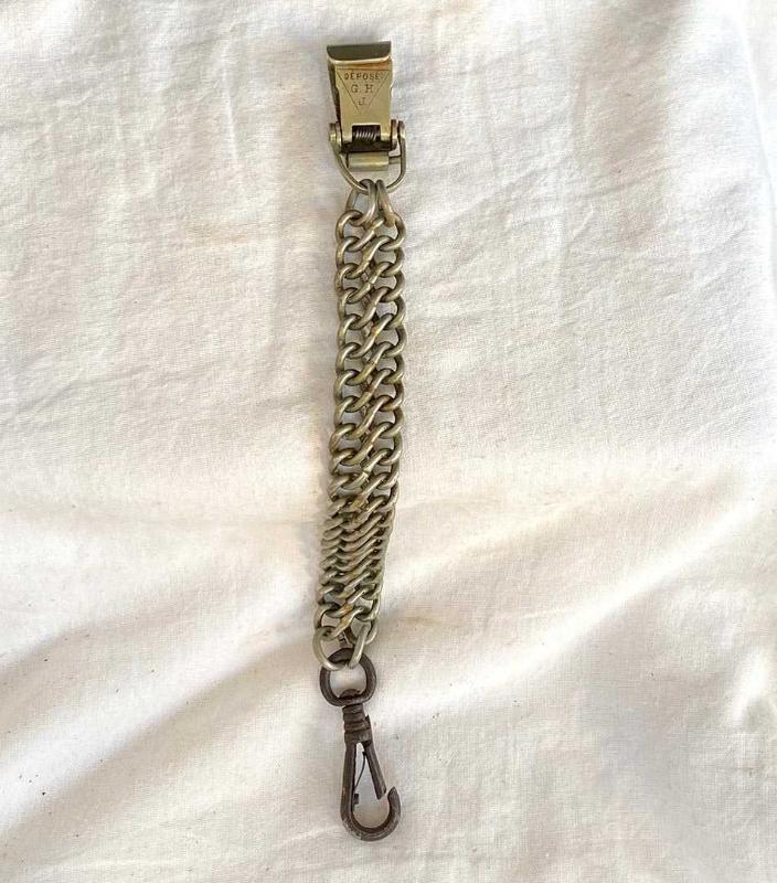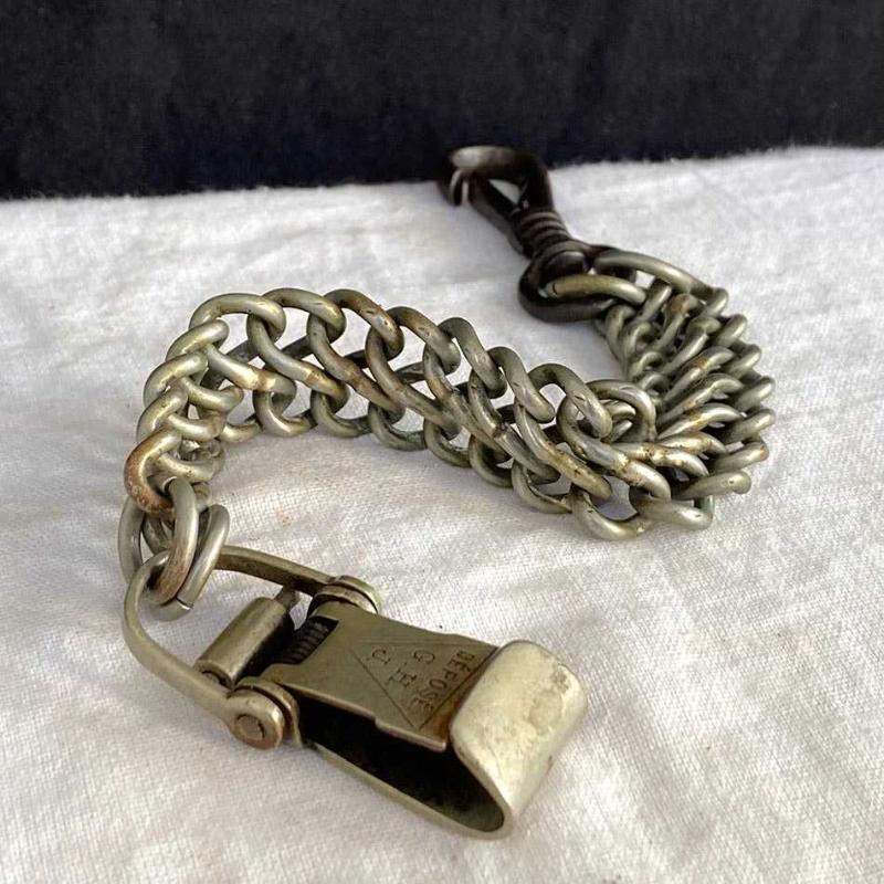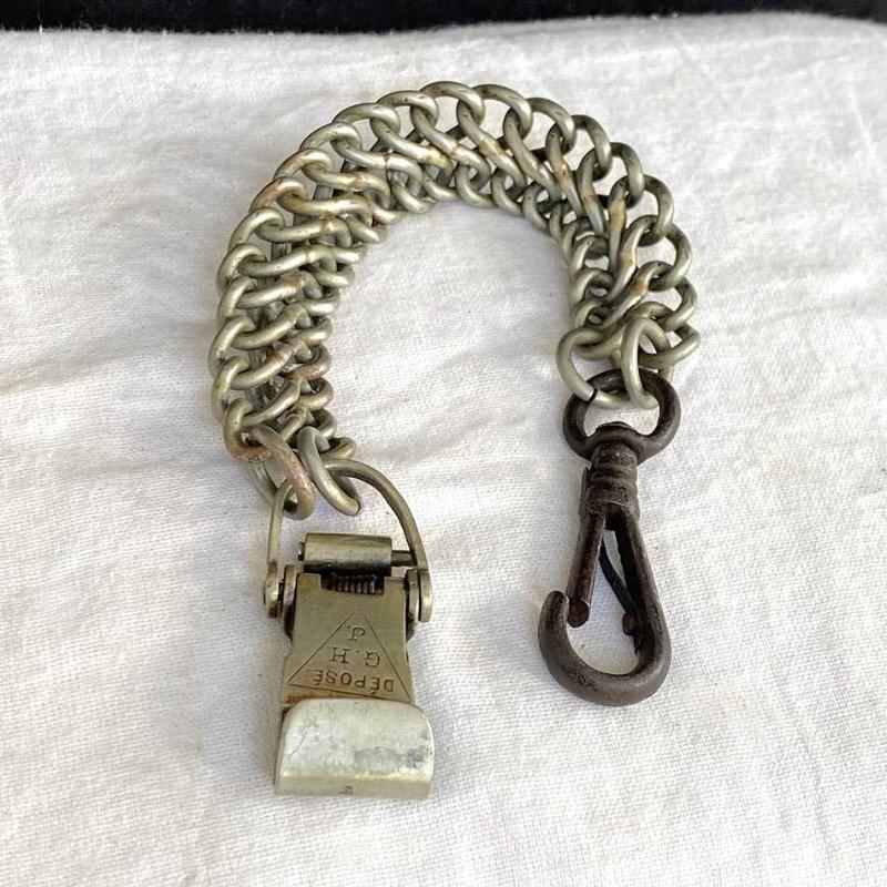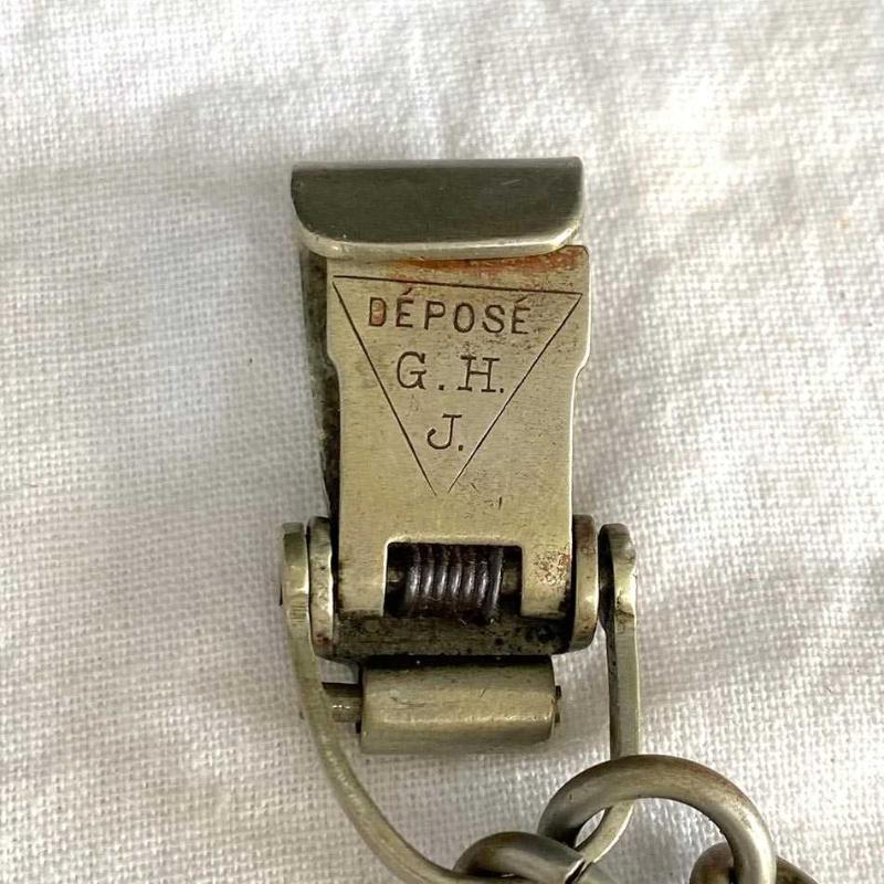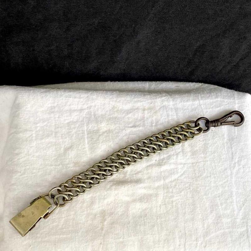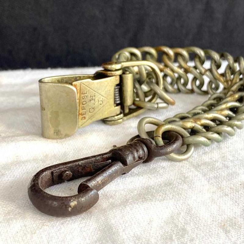 Zarif kılınç zinciri, geçtiğimiz yüzyılın başlarından nadir bir Fransız askeri aksesuarı. Zincirin bir ucundaki siyah demir kanca kılıç kabzasındaki halkaya takılıyordu. Diğer uçtaki pirinç döküm kanca, kemerin üzerindeki sağlam bir deri aparata takılıyordu. Kılıçlar ağır olduğu için çift halka zincir, yükü taşımak ve kopmayı engellemek için tasarlanmıştı. Subaylar yürürken kılıcın yere çarpmasını engellemek veya kılıcı daha yukarıda, eliyle kavrayabileceği bir seviyede tutmak için bu zincirleri kullanırlardı. Bir uçtaki siyah kanca demir döküm, diğer uçtaki kanca ve zincir pirinçten üretilmiş. Pirinç kancanın üzerinde, üçgen şekil içinde askeri standartlara göre tescillendiğini gösteren Fransızca "DEPOSE G.H.J" damgası yer alıyor. Askı zinciri yaşına göre iyi durumda, parçaları sağlam ve temiz. Herhangi bir kırık vs yoktur. 27 cm 100 gr