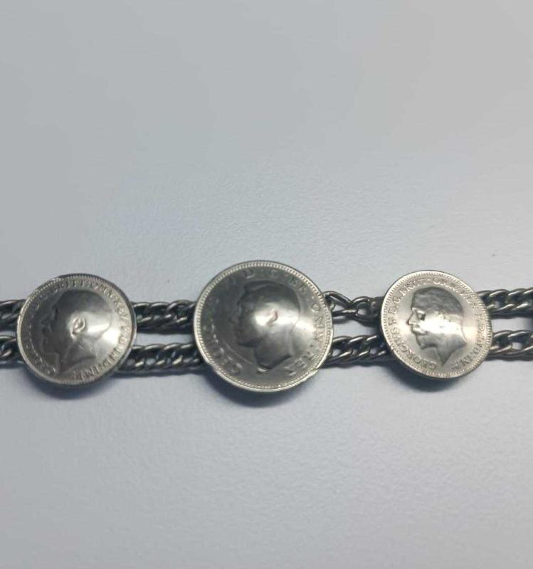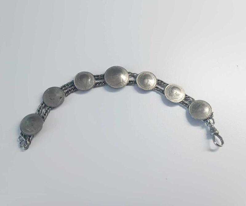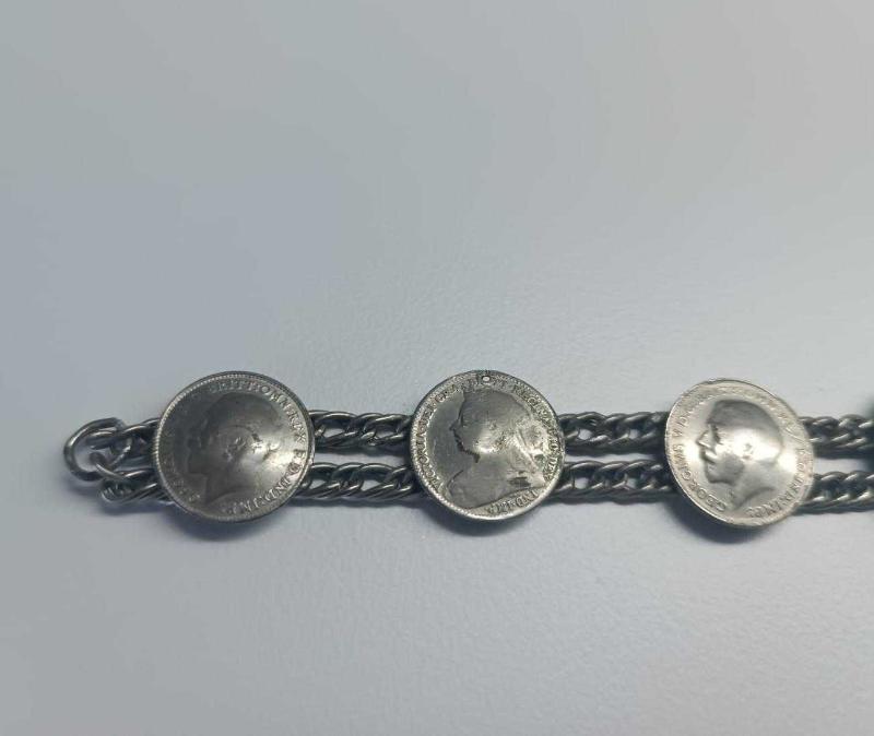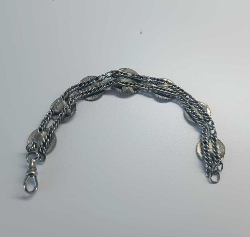 Antika Gümüş Kaplama İngiliz Madeni Paralı Cep Saati Aksesuarı FOB başlıklı antika/koleksiyon objesinin menşei belirtilmemiştir. Objenin ait olduğu dönem bilinmeketedir.