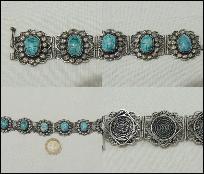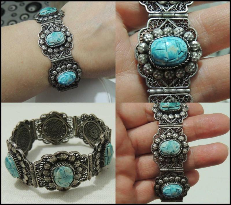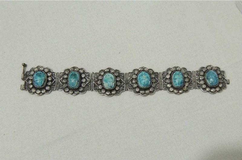 Antika Gümüş Telkari El yapımı Scarab Bilezik Mısır 0024 başlıklı antika/koleksiyon objesinin menşei belirtilmemiştir. Objenin ait olduğu dönem bilinmeketedir.