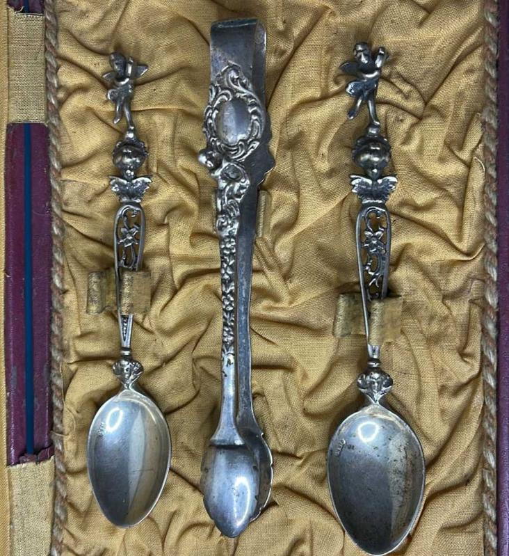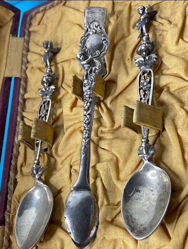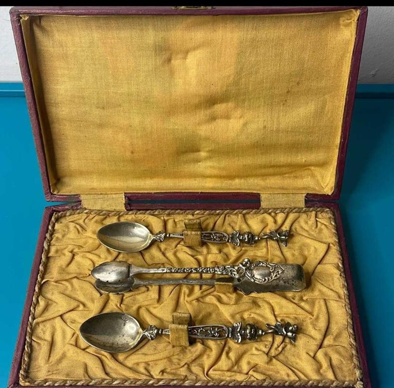 Orijinal kutusunda gümüş kaşıklar ve şeker maşası