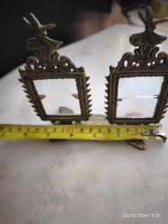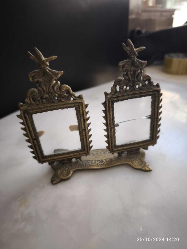 " Antika " İKİLİ PİRİNÇ KÜÇÜK RESİMLİK-ÇERÇEVE MEVLANA TEMALI TEK CAMLI CAMI ÇATLAK başlıklı antika/koleksiyon objesinin menşei belirtilmemiştir. 1940 sonrası dönemine aittir.