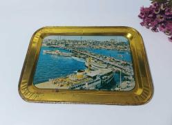 Antika İstanbul Eminönü - Galata Köprüsü Resimli Tepsi - Duvar Dekoru - Metal Tabak Çay Kahve Servis Tepsisi