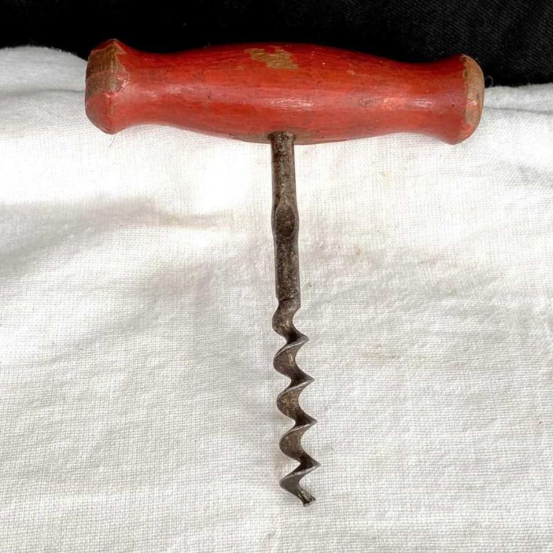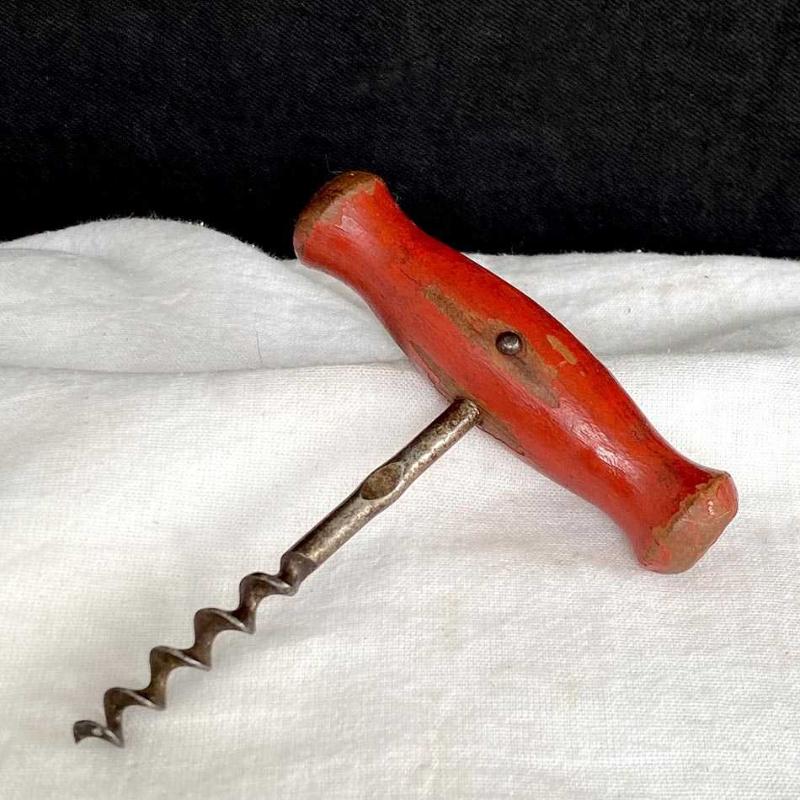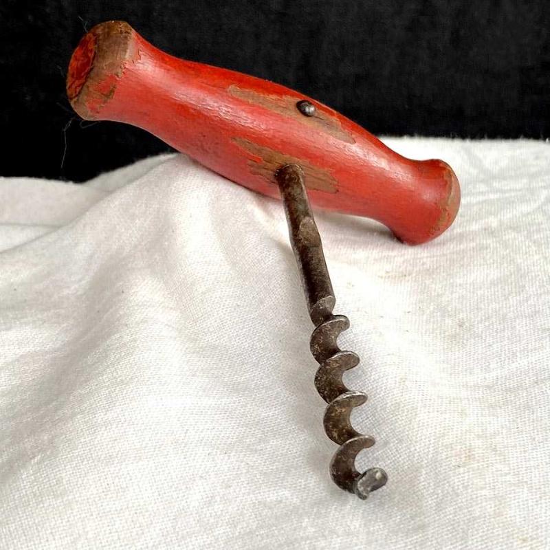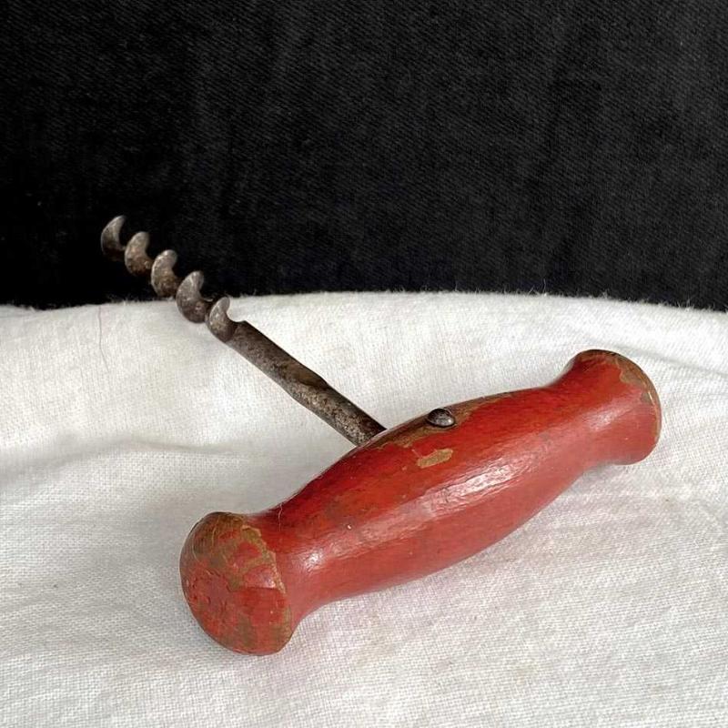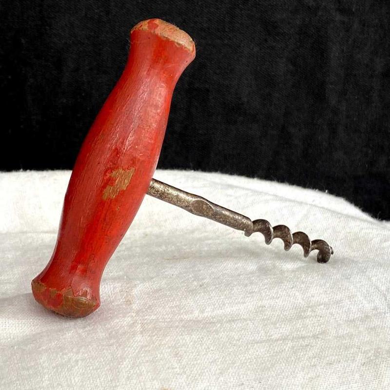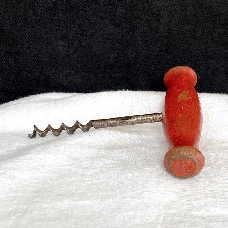 Geçtiğimiz yüzyılın başlarından Avrupa üretimi T saplı tirbuşon. Kırmızı renkli ahşap saplı alet dövme demirden el üretimi. Tirbuşon yaşına göre iyi durumda. Ahşap sap ve metal burguda doğal ve güzel bir patinaya sahip. Herhangi bir kırık vs yoktur. 9x11 cm 40 gr