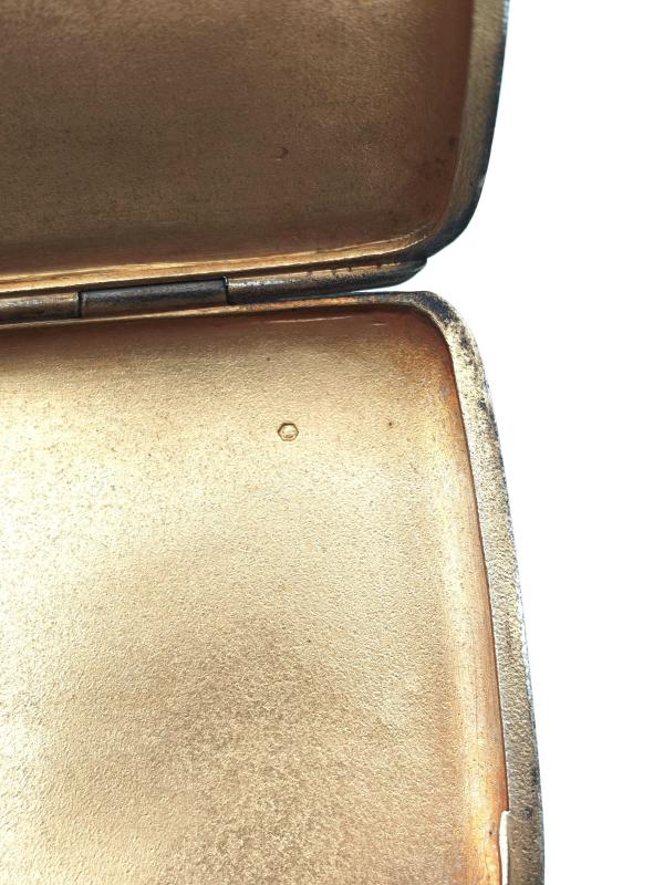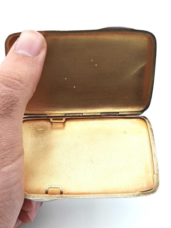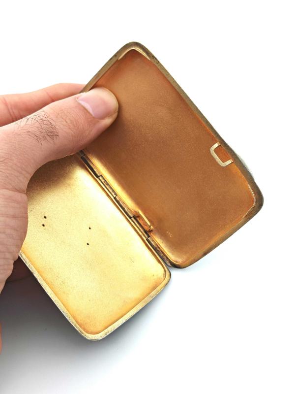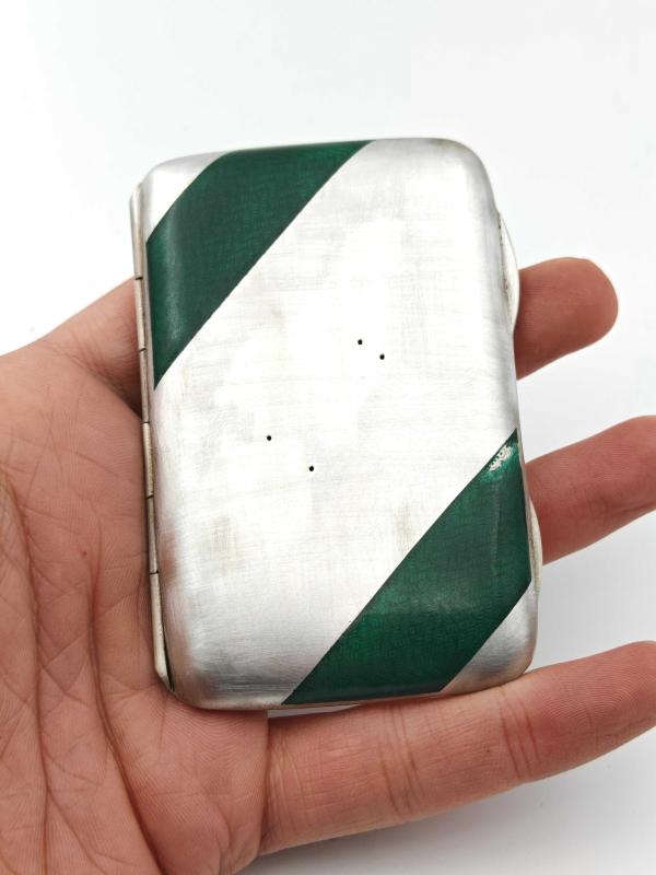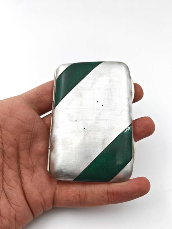 Bu ürün: Koleksiyon/Antika Yeşil Mineli Gümüş Tabaka -Koleksiyon/Antika hediyelik üründür. -Ölçü yaklaşık: 9 cmx6 cm (boy, en), ağırlık: 93 gram -Ağır gümüş ürün, içi altın kaplama, üzeri yeşil mineli, GAS damgalı, kendinden yaylı tabaka -Not: Minesinde ufak atık vardır, inisiali çıkarılmış, inisial yerinde delikler mevcuttur. Ayrıntılar fotoğraflarda gösterilmiştir. Önemli Not: Lütfen açıklamaları ayrıntılı olarak okuyup fotoğrafları dikkatle inceleyiniz. Saygılarımızla