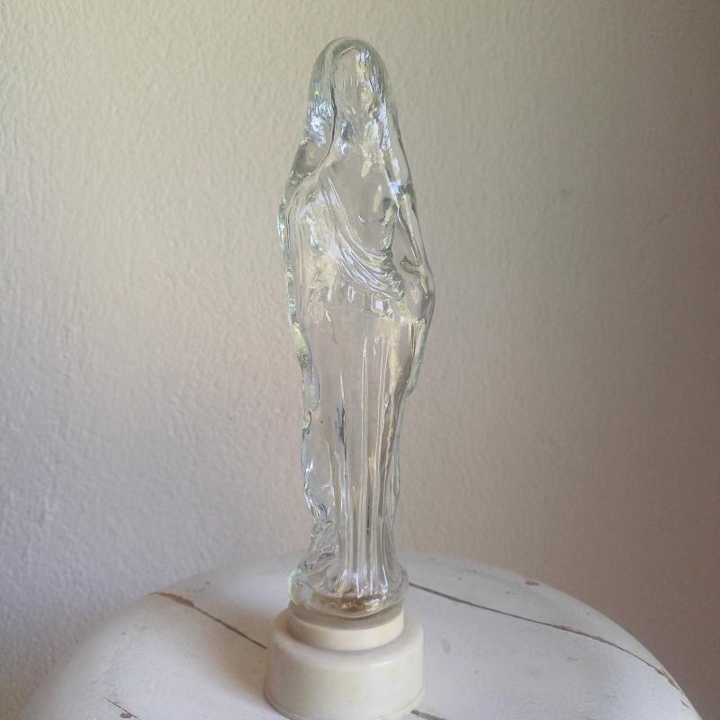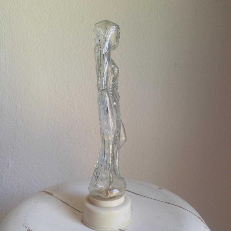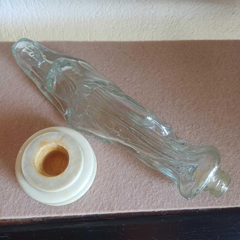 Eskilerden kadın formunda kolonya sişesi. Cocukken bir de Saat Kulesi formunda olani da vardi evimizde, simdiki yapilanlan replikalara benzemeyen. Işte bu kolonya sisesi de o dönemden. Bence çok güzel ve bir dönemin sembolü gibi. Plastik kaideli(ayni zamanda kapak ). Cam kısım kusursuz. Plastik kısım catlak (bkz foto).Ancak duruşta yada strüktürde bir sorun yok.