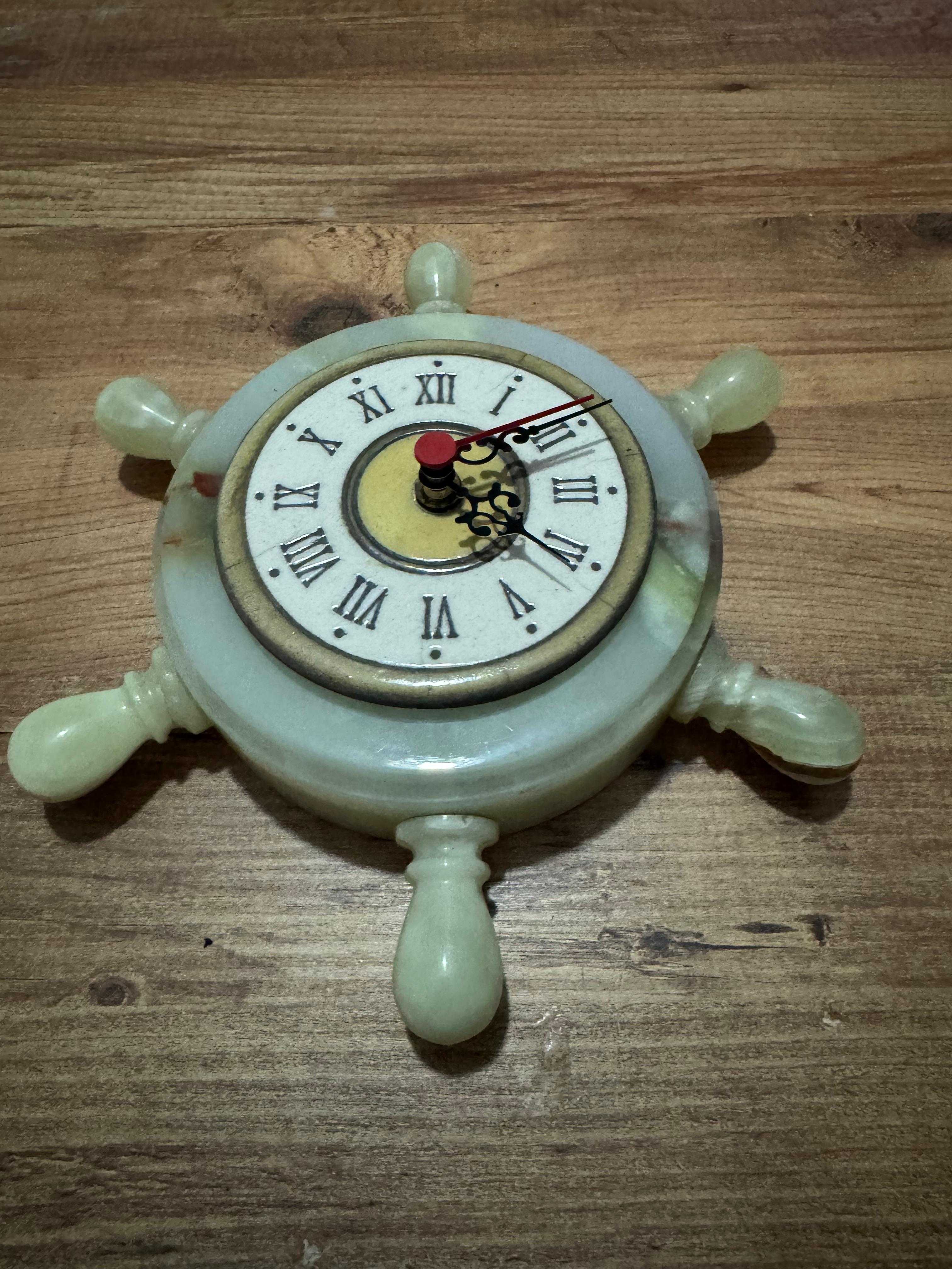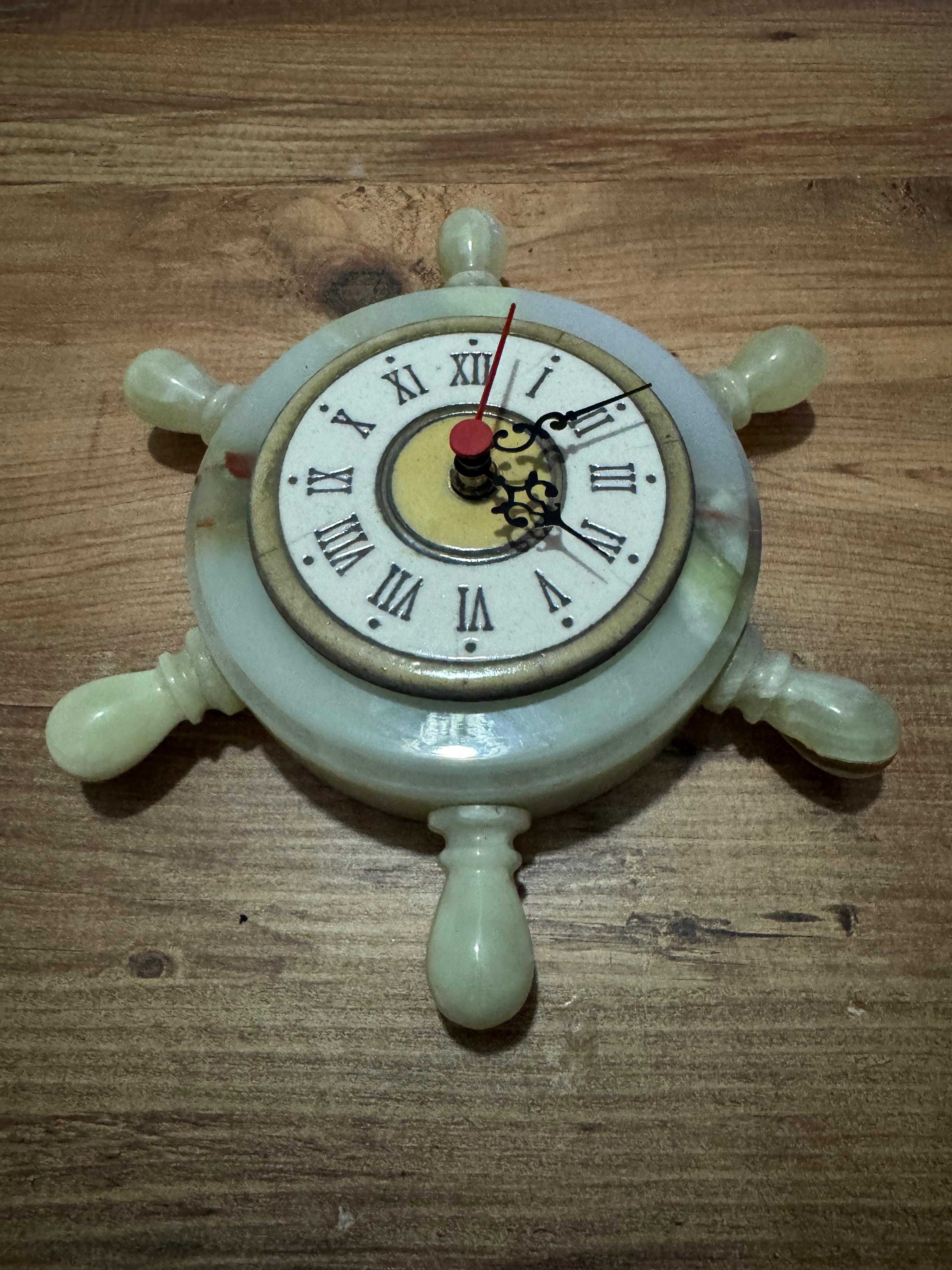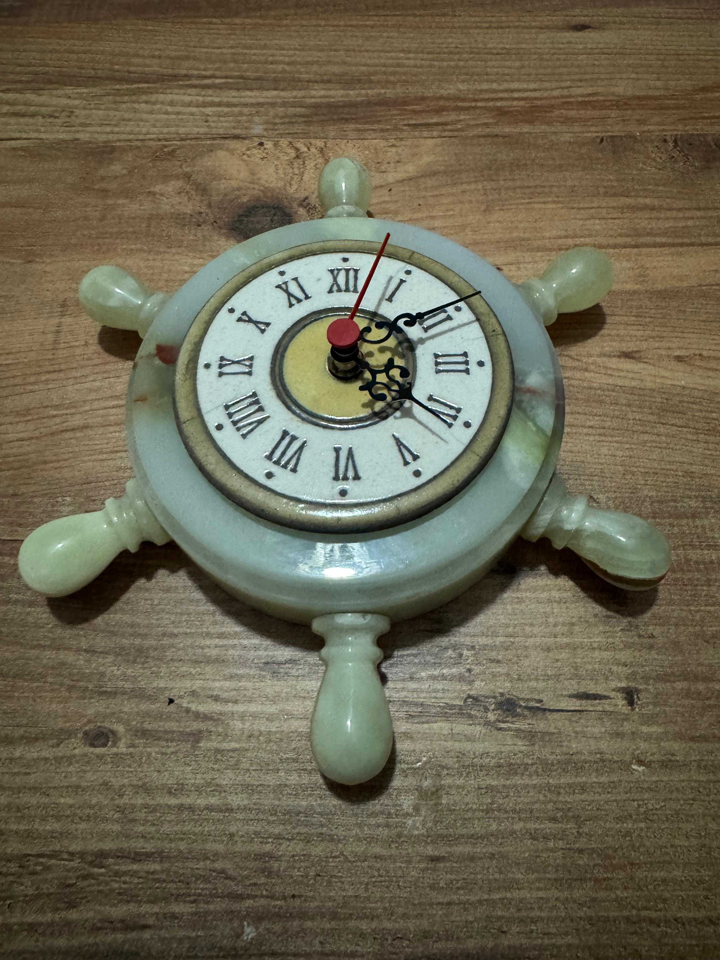 Antika Oniks Doğal Taş Gemi Dümeni Duvar Saati Çalışır durumda Dümen çapı 25 cm Saat için iç gövde çapı 9 cm Dış gövde çapı 15 cm Her hangi kırığı çatlağı yok.
