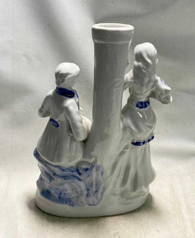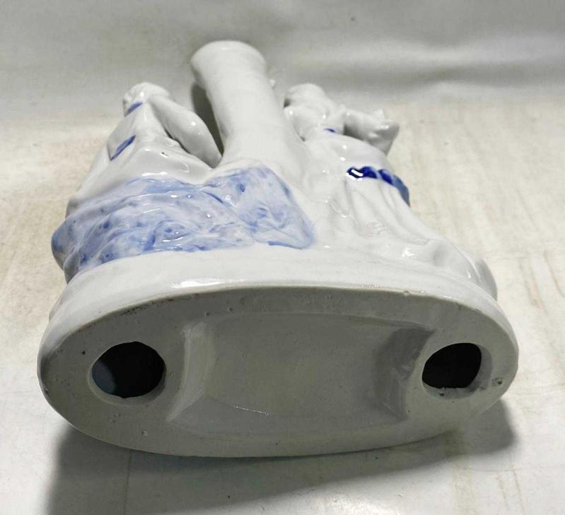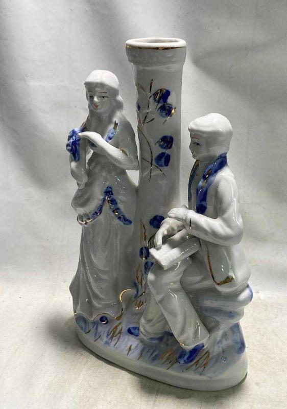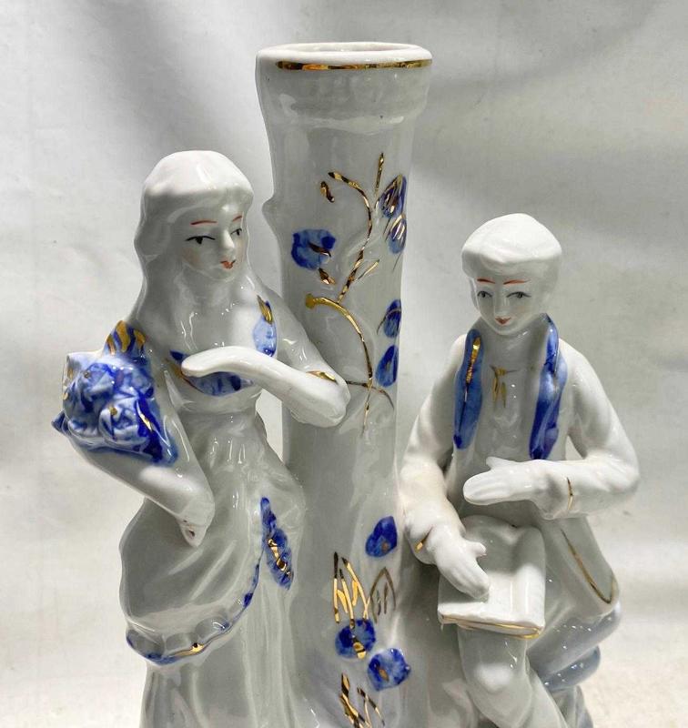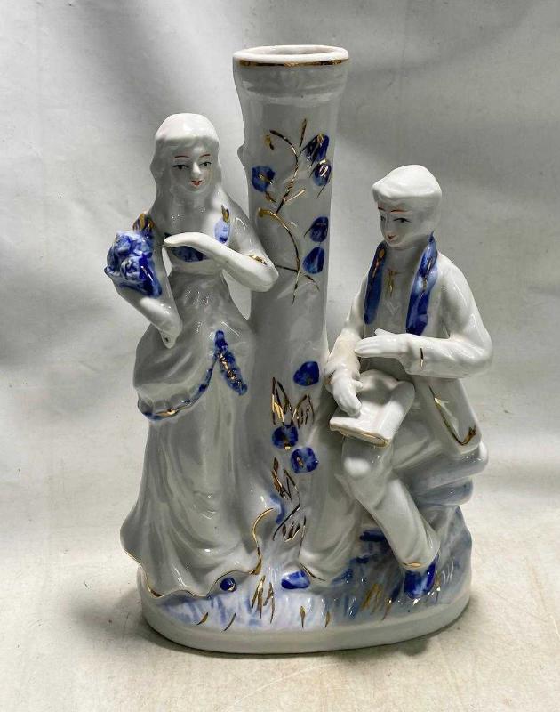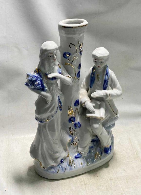 Antika Porselen Biblo, Biblo Vazo Yüksek kalite porselen malzemeden Rokoko etkisi taşıyan, kadın ve erkek formunda neo-klasik romantizm tarzında sahneleme kompozisyonlu, parlak sır üzeri kobalt mavisi el boyama ve yaldız geçme inanılmaz şık eski biblo vazo. Yükseklik:26 cm Genişlik:15 cm