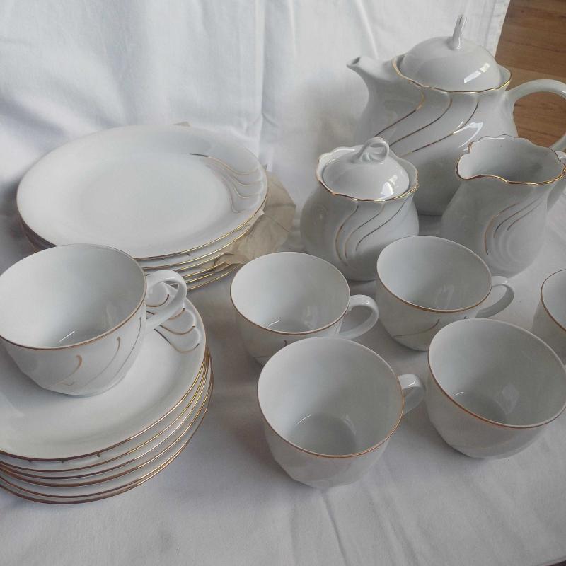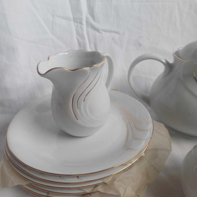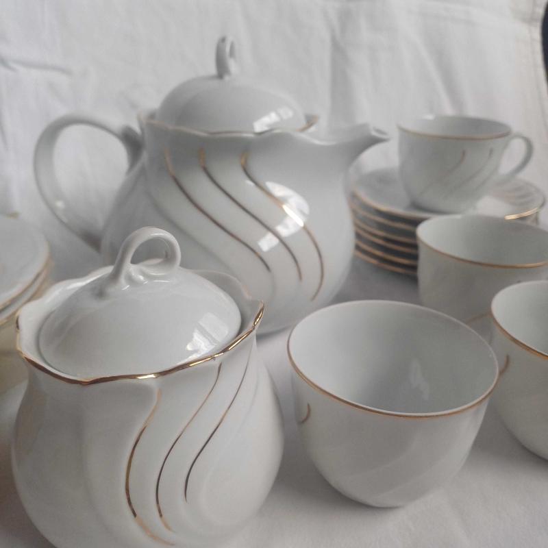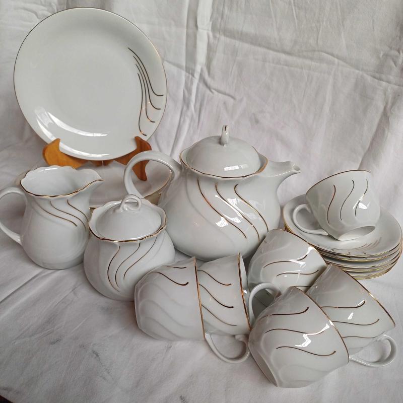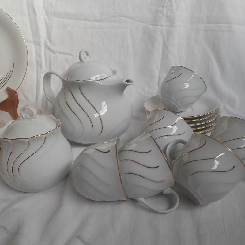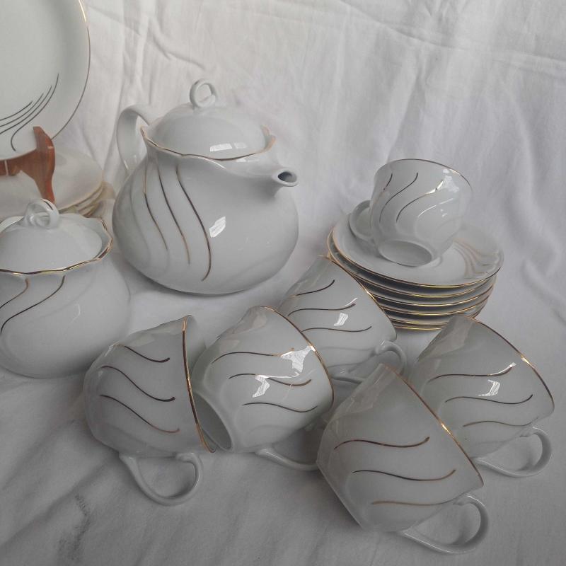 Incecik Polonya Porseleni. Mukemmel kondisyon. Uzun yillar vitrin beklemiş ve bugunlere sapasaglam gelmis. Cok zarif ve sade bir tasarim. Cekoslavakya'dan alinmisti yil 1970 sonu,80 başı. En ufak bir kusuru yok. Damgali. Zarif altin konturlu. 6 Cay fincani + 6 Cay Tabaği +6 Pasta Tabağı+Sütlük +Sekerlik(kapakli)+Teapot(kapakli) 21 parça,kapaklarla 23 parca Caydanlik 19 x 19 cm Pasta Tabaği 20 cm Sutluk 10 x 10 cm Cay fincani 8 x 6 cm Cay Tabagı 14 cm Sekerlik 12 x 12 cm