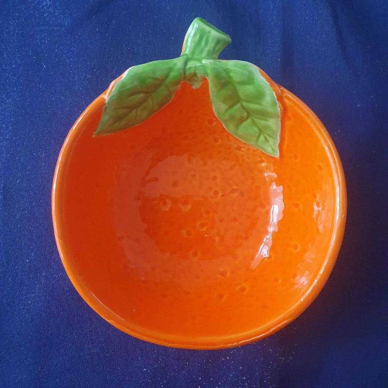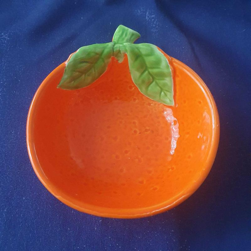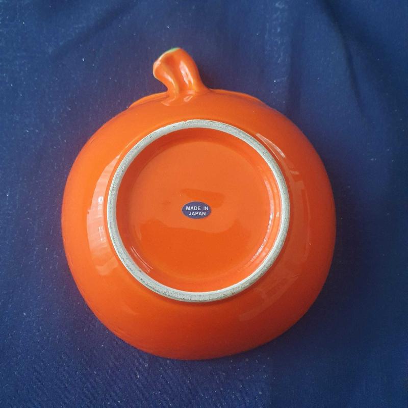 Meyve veya atıştırmalık servis etmek için ideal, parlak turuncu renkli, portakal şeklinde şirin bir kase. Üzerindeki yeşil yaprak detayları ile sofralarınıza neşe katacak. / Antika Seramik Turuncu Kase Tabak Tutucu Japonya 20. Yüzyıl Sonu El Boyaması
