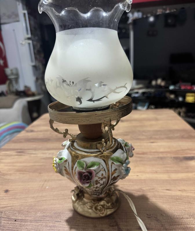 Antika Tarzı Porselen Capodimonte Çiçekli Gece Lambası / Abajur El yapımı kabartma porselen çiçeklerle süslenmiş, gold (altın rengi) işlemeli gövde. Üzerinde zarif kelebek ve doğa desenleri bulunan, buzlu camdan özel üst başlık. Çalışır vaziyettedir. Fotoğraflarda görüldüğü üzere yaşına bağlı olarak porselen çiçeklerin bazılarında ufak deformasyonlar mevcuttur (antik/vintage bir hava katmaktadır)., en son 2 ay önce güncellenmiştir.