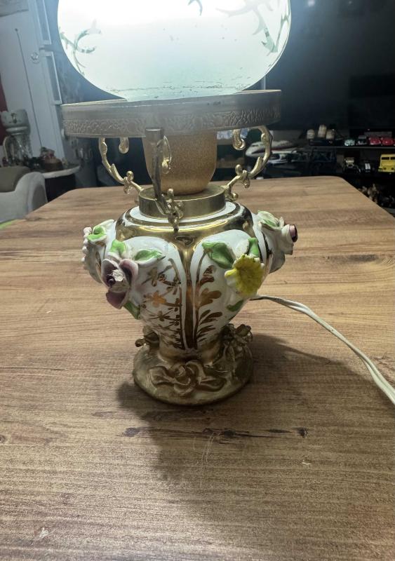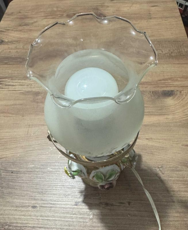 Antika Tarzı Porselen Capodimonte Çiçekli Gece Lambası / Abajur El yapımı kabartma porselen çiçeklerle süslenmiş, gold (altın rengi) işlemeli gövde. Üzerinde zarif kelebek ve doğa desenleri bulunan, buzlu camdan özel üst başlık. Çalışır vaziyettedir. Fotoğraflarda görüldüğü üzere yaşına bağlı olarak porselen çiçeklerin bazılarında ufak deformasyonlar mevcuttur (antik/vintage bir hava katmaktadır). başlıklı antika/koleksiyon objesi Avrupa menşe’lidir. Objenin ait olduğu dönem bilinmeketedir.