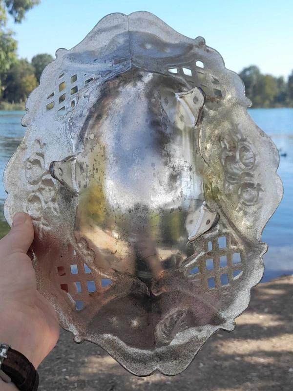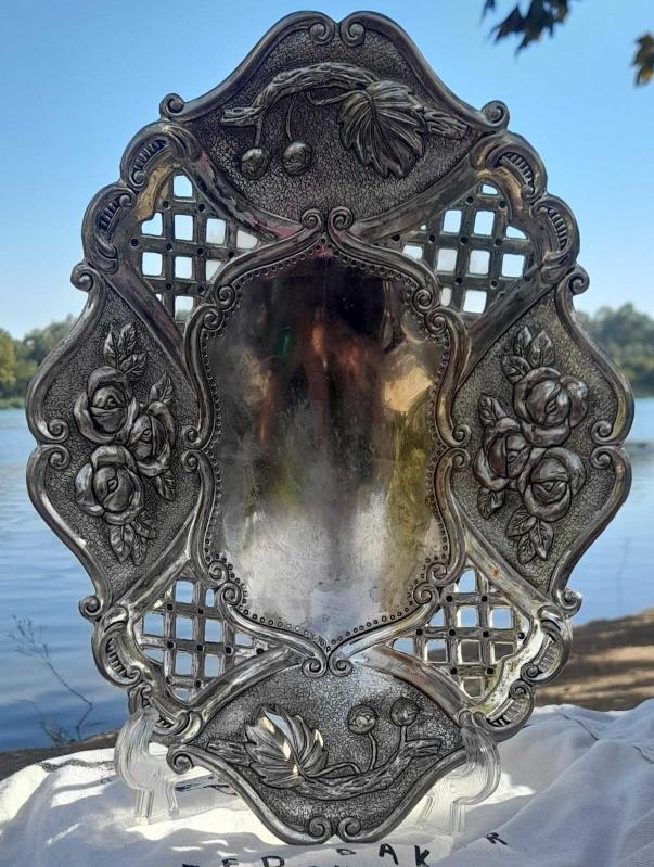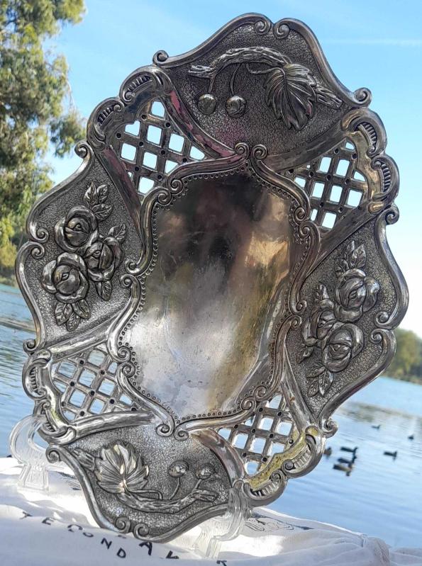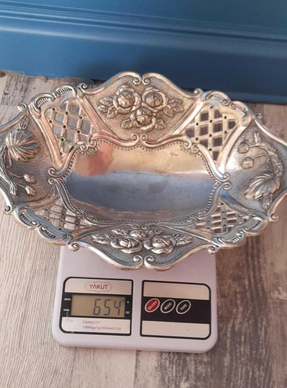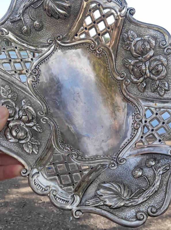 Antika ağır metal gümüş kaplamalı çiçekli ayaklı kase - gondol. Ağırlık 650 gram. Çok az aşınma var. Ölçüleri ve durumu fotoğrafta mevcut 30×22×6,5 cm.