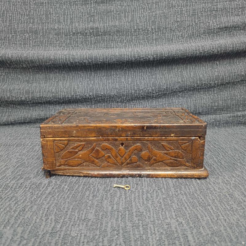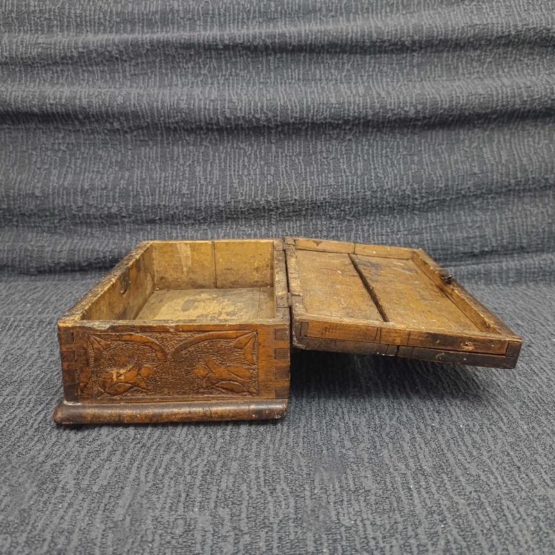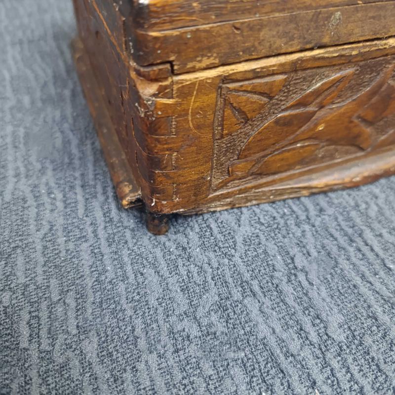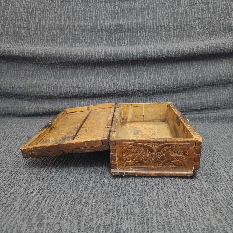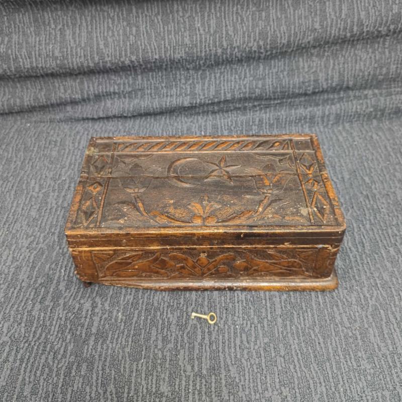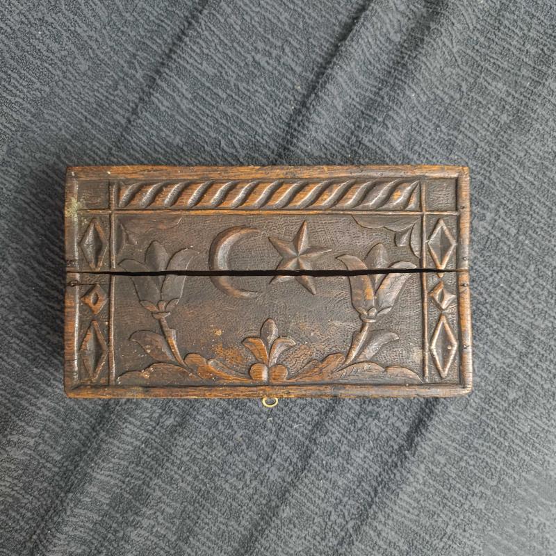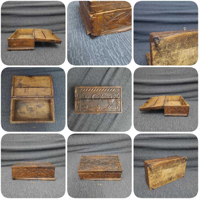 Osmanlı Sonu – Cumhuriyet Başları Dönemi El Yapımı Masif Ahşap Kutu Oyma ve kırlangıç geçme tekniğiyle hazırlanmış, el yapımı bir kutudur. Üzeri hilal–yıldız ve çiçek motifleriyle süslenmiştir. Alt kısmında eksik parça ve kapağında çatlak bulunmaktadır; yaşına bağlı doğal kullanım izleri mevcuttur. Anahtarı mevcuttur ve kapağı kitlenebilir. Dekoratif ve koleksiyonluk bir üründür. Ölçüler: 28 × 16 × 10 cm