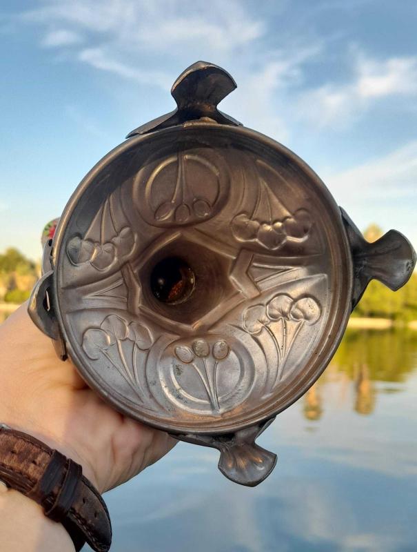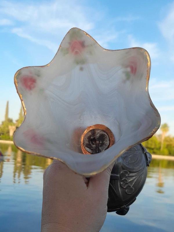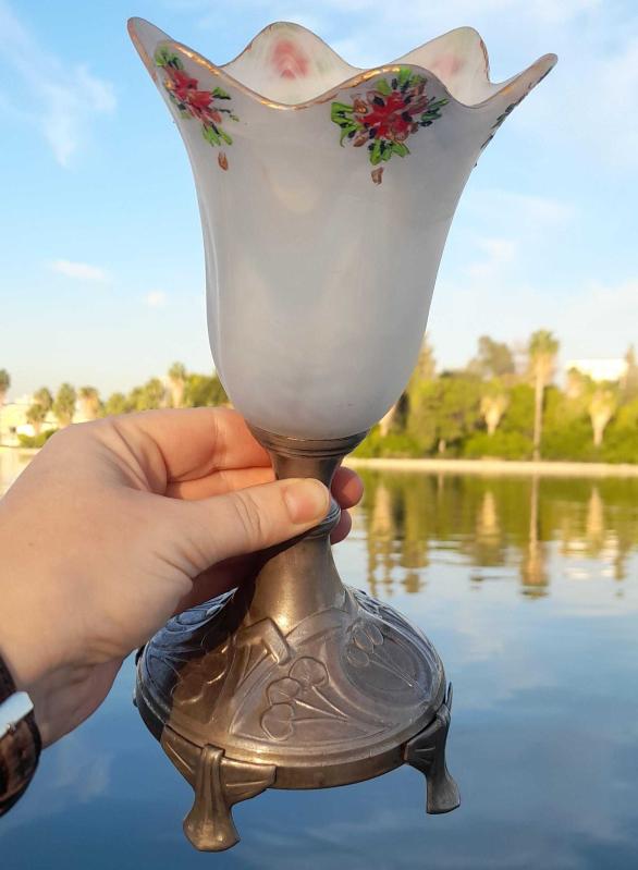 Antika art nouveau opalin mat cam ve metal mumluk başlıklı antika/koleksiyon objesi Avrupa menşe’lidir. 1900-1949 arası dönemine aittir.