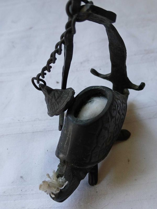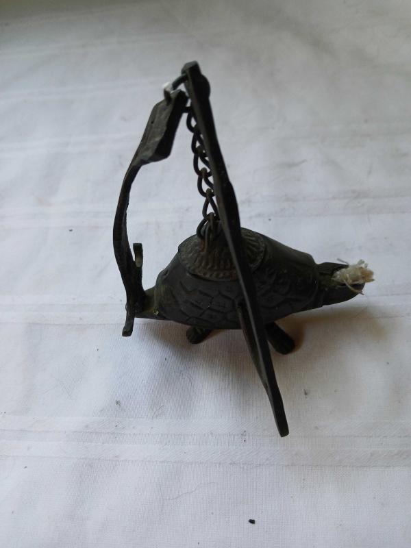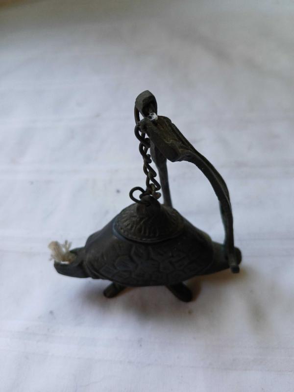 Antika görünümlü kaplumbağa formunda yağ kandili başlıklı antika/koleksiyon objesinin menşei belirtilmemiştir. 1900-1949 arası dönemine aittir.