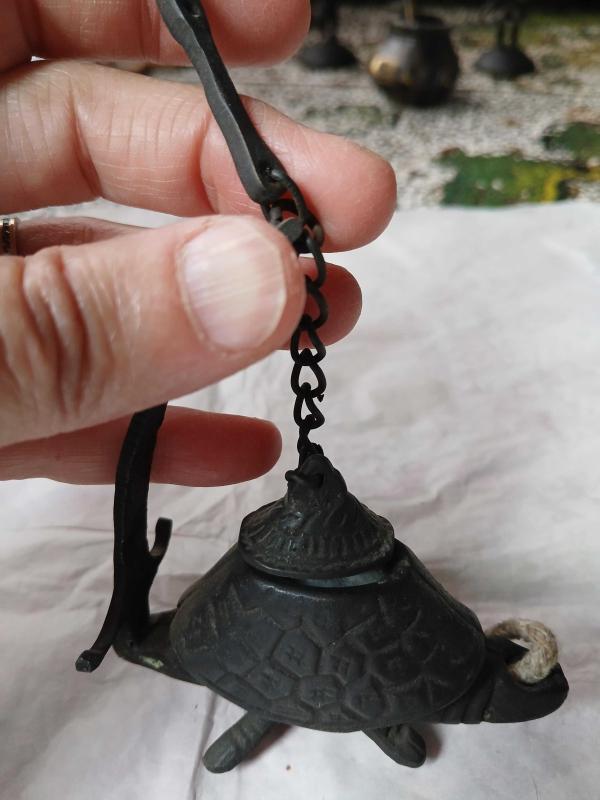 Antika Görünümlü Kaplumbağa Şeklinde Bronz Yağ Kandili,Buhurdanlık Kaplumbağa Figürü Uzun Ömür VE Bilgeliği Temsil Eder Dekoratif Amaçlıda Kullanılır ÖLÇÜLERİ:(Askısı ile komple uzunluk:19cm) (Eni:8cm)