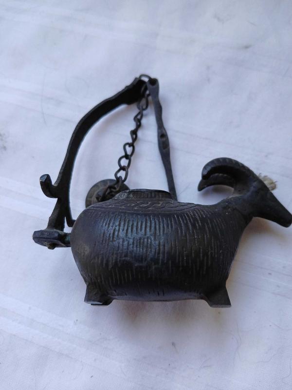 Antika görünümlü koç formunda yağ kandili başlıklı antika/koleksiyon objesinin menşei belirtilmemiştir. 1900-1949 arası dönemine aittir.