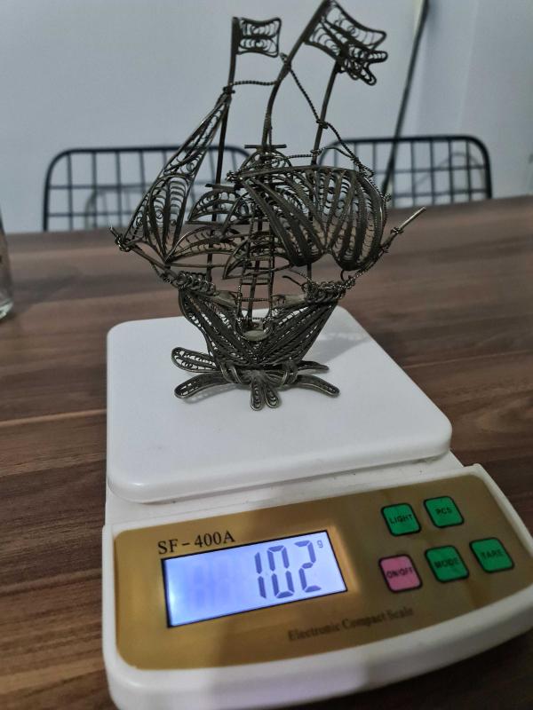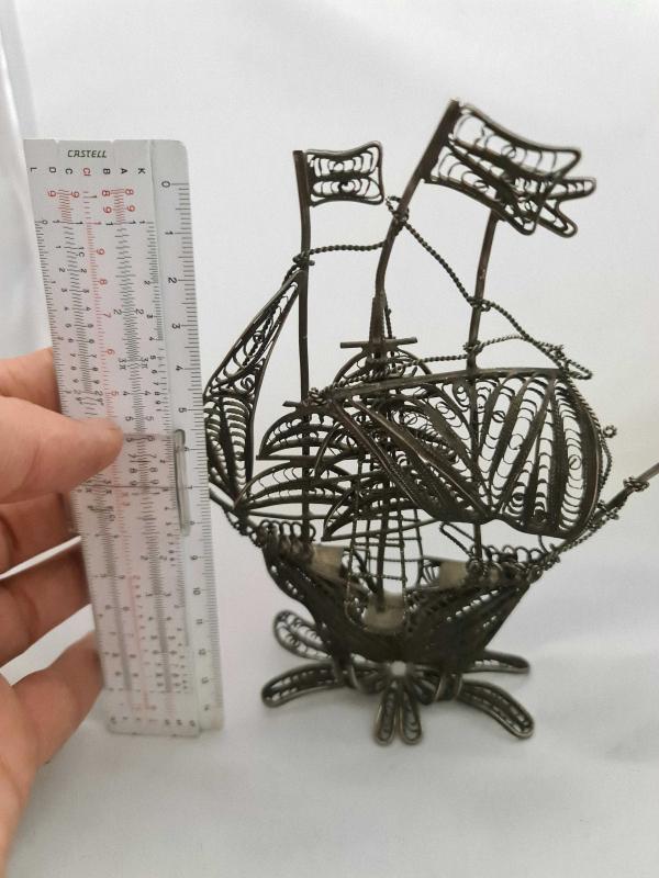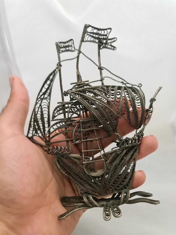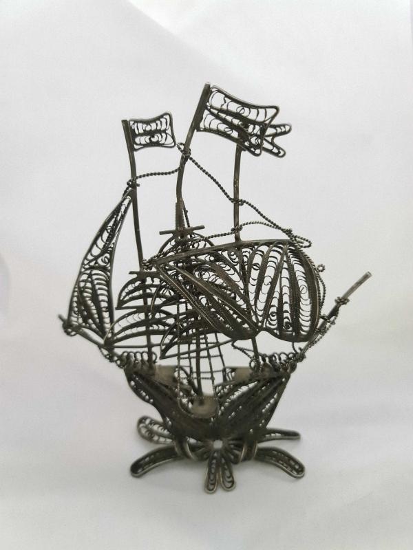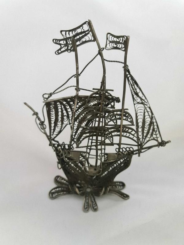 Antika gümüş, telkari işçilikli gemi başlıklı antika/koleksiyon objesinin menşei belirtilmemiştir. Objenin ait olduğu dönem bilinmeketedir.