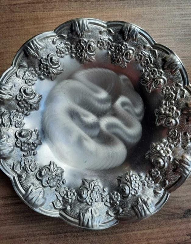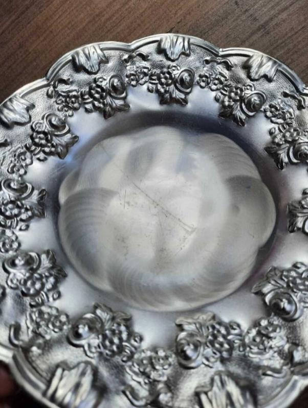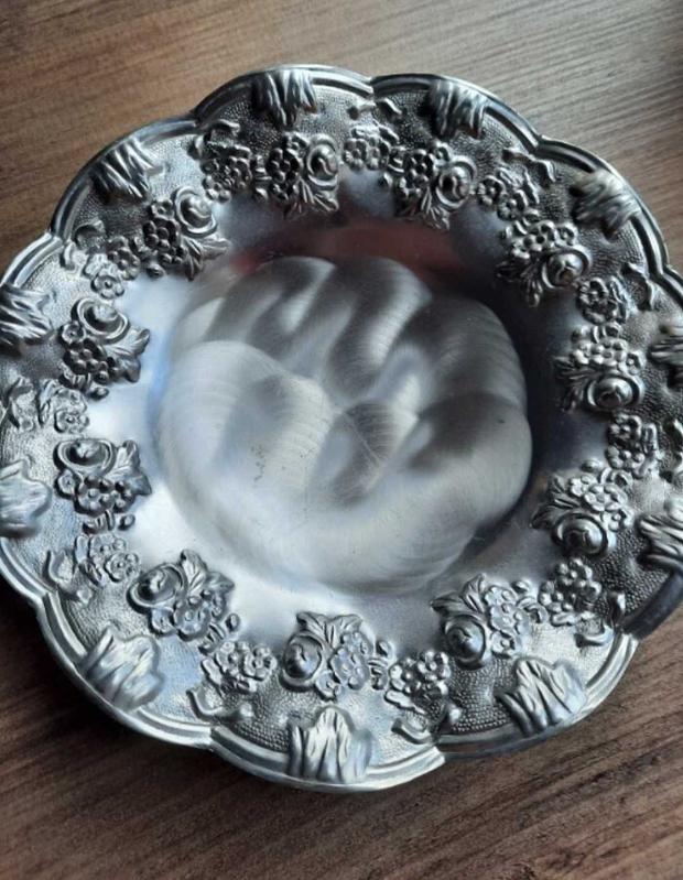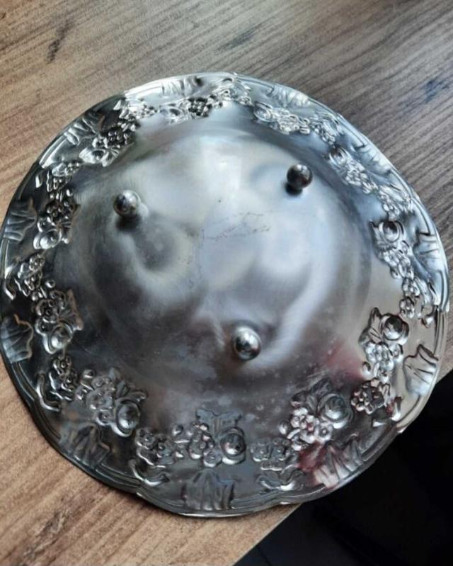 Kabartma desenli gümüş kaplama tabak, 3 ayaklı.