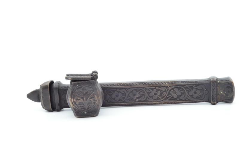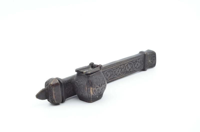 Antika koleksiyon pirinç dekorluk divit hokka başlıklı antika/koleksiyon objesinin menşei belirtilmemiştir. Objenin ait olduğu dönem bilinmeketedir.