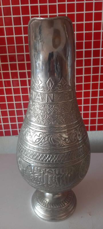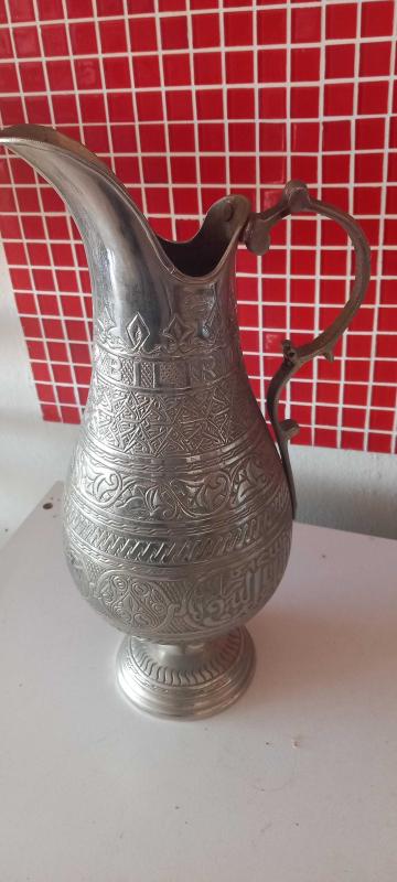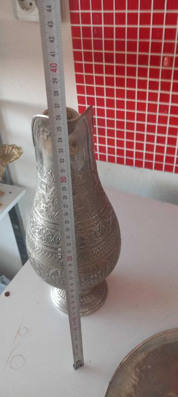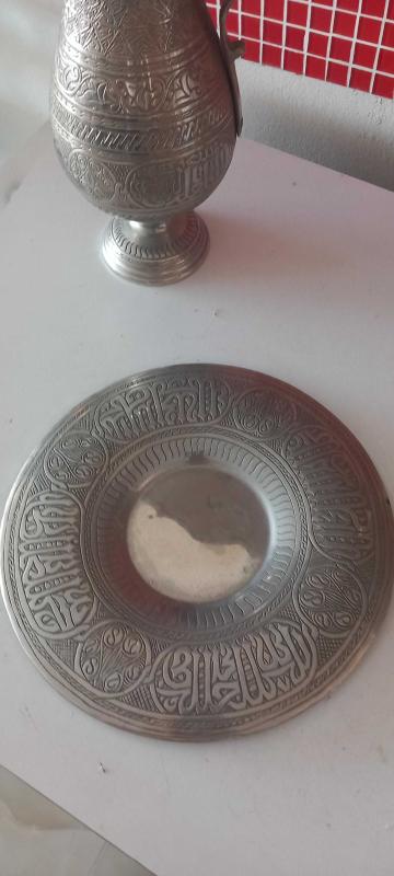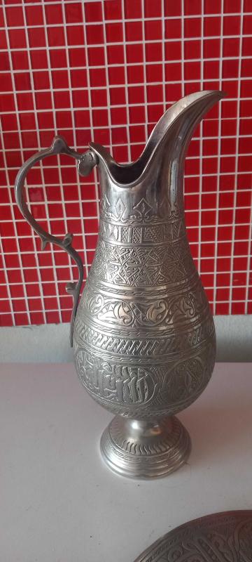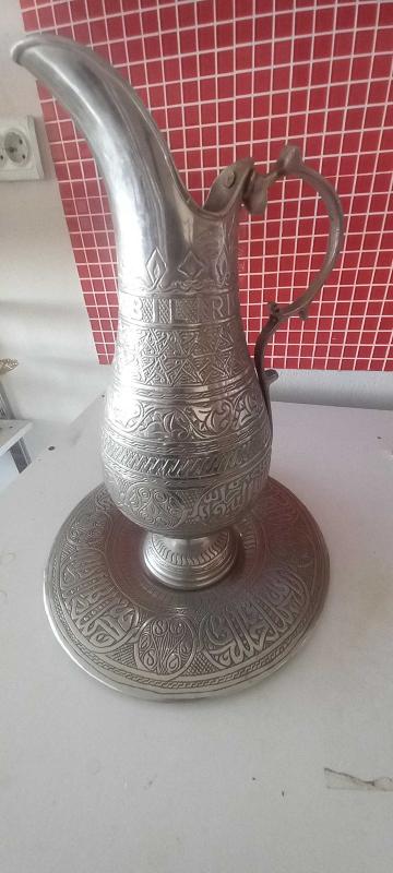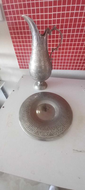 Antika tabaklı bakır sürahi ful işlemeli sürahide ve tabağında kufi yazılarla ayetler yazıyor ölçüler resimde mevcut temiz ve sağlamdır