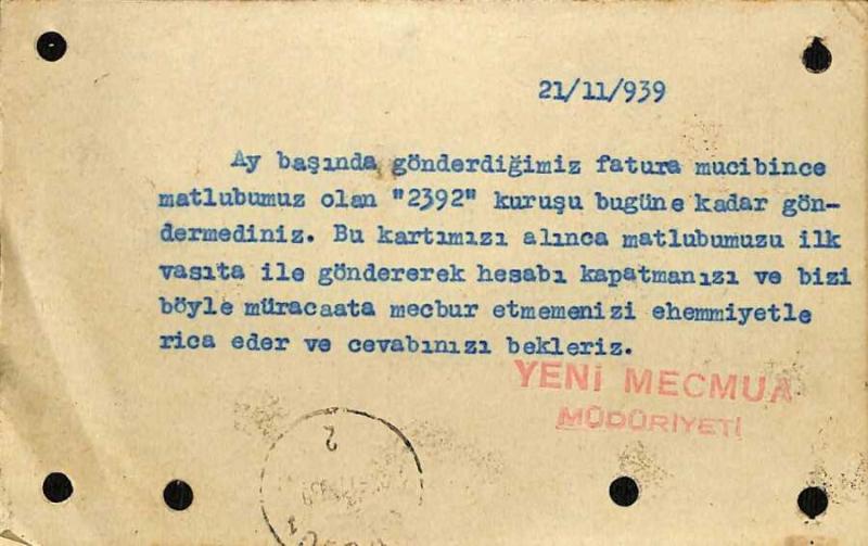 Antiye - 1939 Yeni Mecmua İşyeri Kartı Postadan Geçmiş Antiye EFM7507 başlıklı ürün, Efemera, Müzik, Sinema > Pullar, Zarflar, Kartlar kategorisi altında İkinci El olarak satılmaktadır.