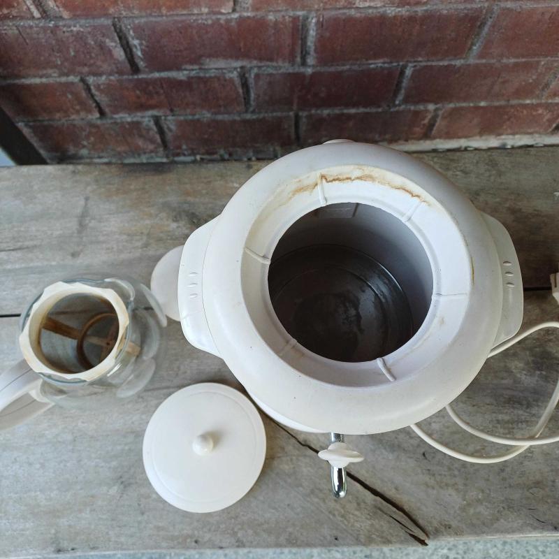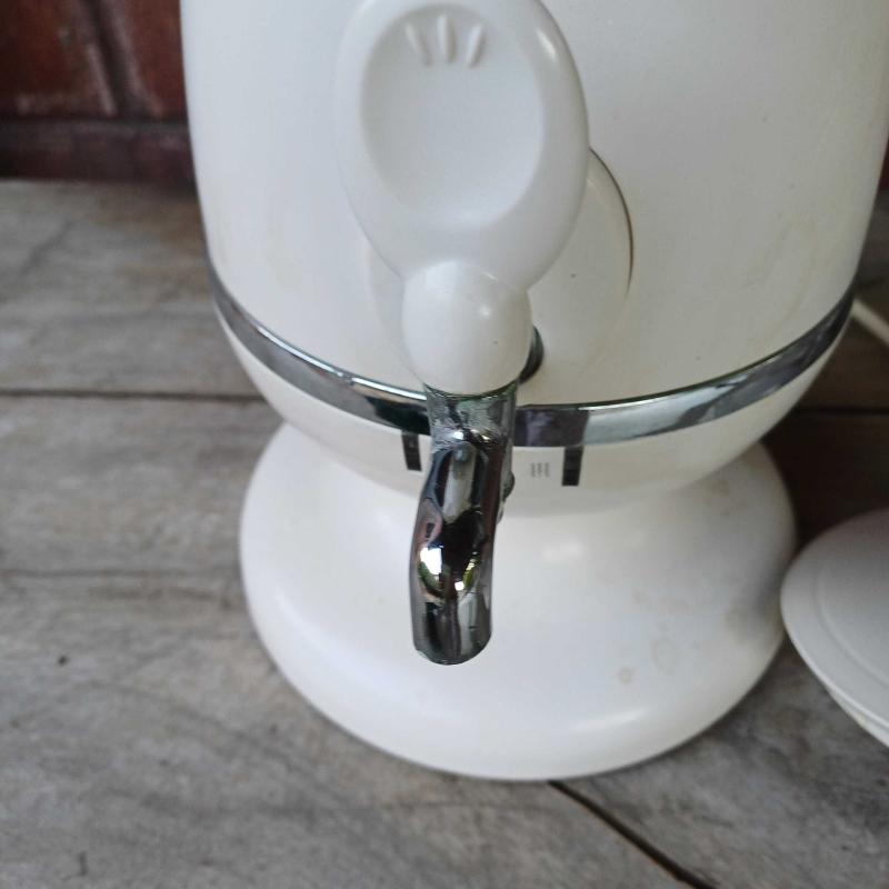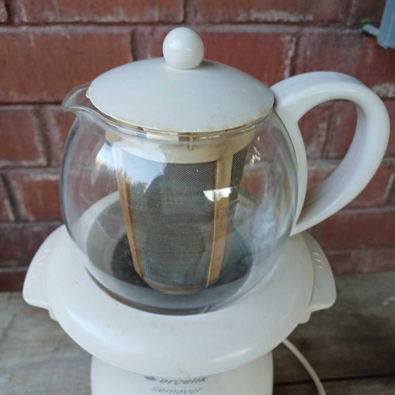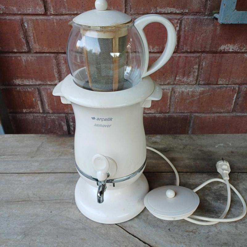 Arcelik elektrikli semaver. Cam demlik. Yikanabilir filtre. Calisir vaziyette. Musluk tapasi kireclenmis ,dönmüyor. Semaverin ayri kapagi da mevcut. Fiziksel.olarak iyi durumda. Demliğin plastik kapagi tirnaklarla demlige oturuyor.Tirnaklar kirilmis(yani demligi bardaga bosaltirken kapagi tutmaniz gerekiyor o kadar) Krom kapli dis dekoratif kisimda atmalar var.