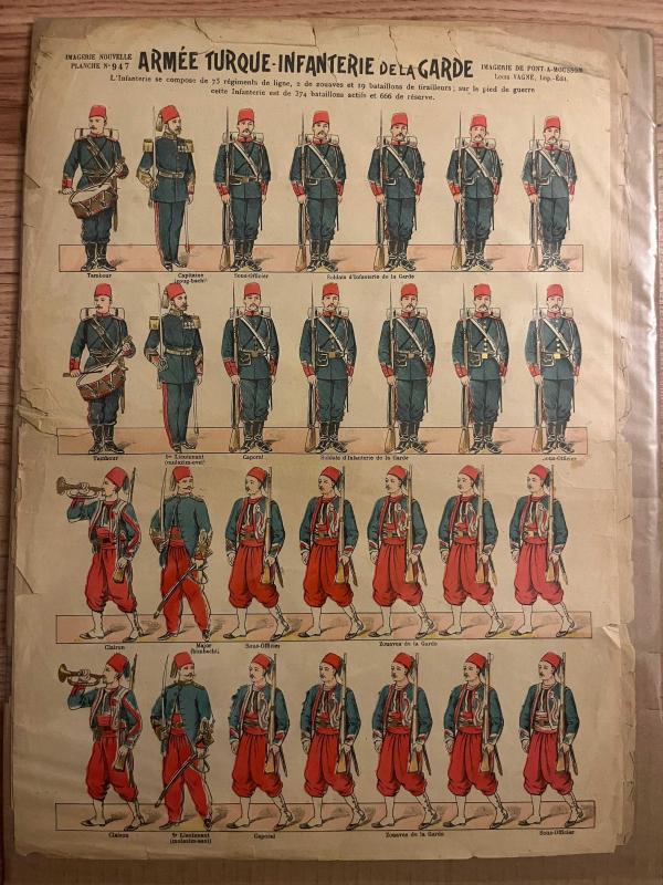 • Başlık: Armée Turque – Infanterie de la Garde (“Türk Ordusu – Muhafız Piyadesi”) • Seri: Imagerie Nouvelle • Planche (Levha) No: 947 • Yayınevi: Imagerie de Pont-à-Mousson • Baskı: Léon Vagné, Imp.-Édit. • Ülke: Fransa • Tarih: Yaklaşık 1870–1890 arası (muhtemelen 1880’ler) Baskı türü: Renkli taşbaskı (chromolithographie) • Kâğıt: İnce, doğal elyaflı, hafif kırılgan hâle gelmiş kağıt • Boyut (yaklaşık): 38 × 28 cm • Renk paleti: Klasik mavi-kırmızı-bej tonları (Osmanlı üniformasının stilize hali) • Durum: • Kağıt kenarlarında yırtıklar, kat izleri ve renk solması mevcut • Ancak baskı alanı büyük ölçüde okunaklı ve bütün • Bu yaşta bir taşbaskı için orts durumda sayılır Levha üç yatay sahneden oluşur: 1. Üst sıra: Mavi üniformalı “Garde d’Infanterie” (Muhafız Piyadeleri) — tambour (davulcu), capitaine, sous-officier ve erler. 2. Orta sıra: Kırmızı pantolonlu, mavi ceketli “Tirailleurs / Zouaves” sınıfı askerler. 3. Alt sıra: Benzer biçimde düzenlenmiş ikinci grup Zuav askerleri. Fransızca açıklamalar, rütbe ve görevleri belirtir: “Tambour”, “Caporal”, “Lieutenant”, “Sous-officier”, “Soldat de la Garde”, “Zouave de la Garde”, vb. Bu tür levhalar, hem oyuncak asker kesip katlama amaçlı, hem de görsel eğitim materyali olarak kullanılmıştır.