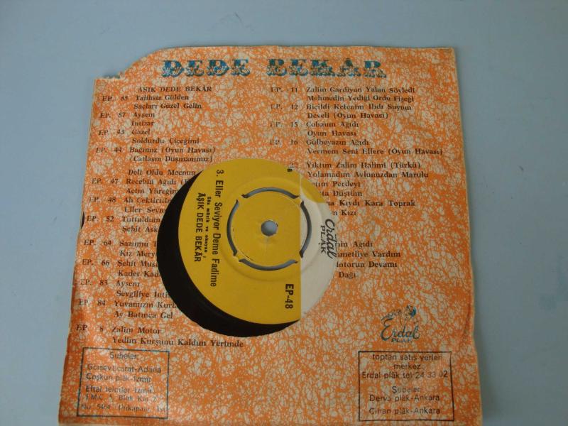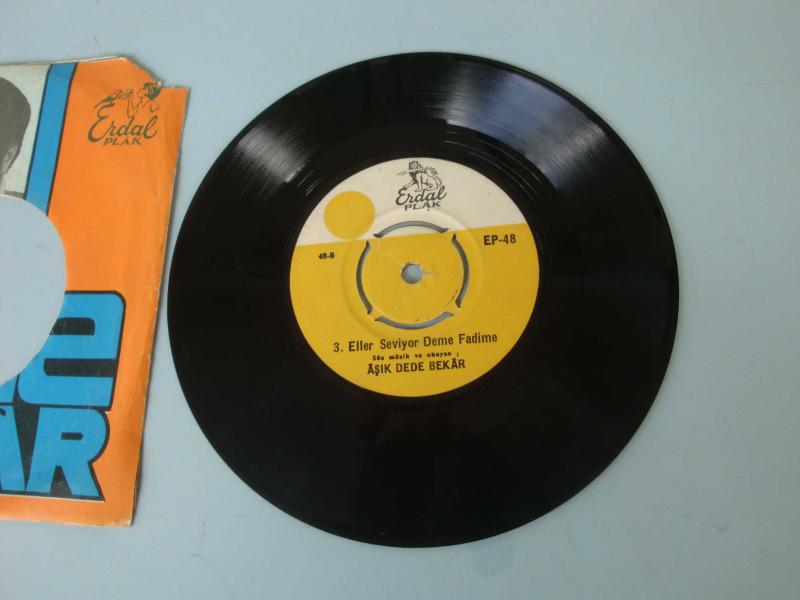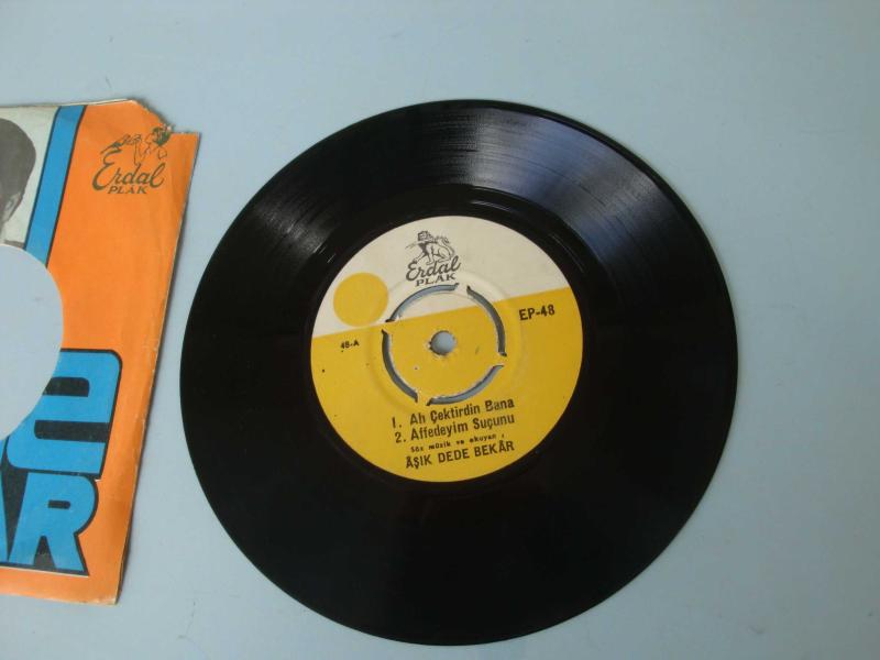 Aşık DEDE BEKAR " Ah Çektirdin Bana - Affedeyim Suçunu - Eller Seviyor Deme Fadime " 45 RPM ( ERDAL PLAK ) Orj. Kapak : 7,5 - Plak : 8,5 Kapak TEMİZ , Plak ÇOK TEMİZ durumda .. NOT : Kapak ortası yanlış kesilmiş , üst köşede kopuk mevcut ..