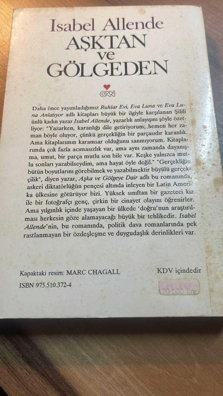 Aşktan ve Gölgeden, Isabel Allende tarafından kaleme alınmıştır. Kitap 1992 yılında Can tarafından [Özal Basımevi matbaası] [İstanbul] 9755103724 ISBN kodu ile yayınlanmıştır. Bu baskının çevirisi Eren Cendey tarafından yapılmıştır. Aşktan ve Gölgeden adlı eser Türkçe dilindedir.