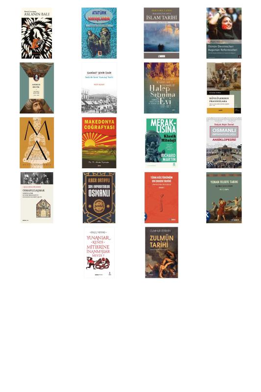 Aslanın Balı - Atatürk Savaşlarda - Başlangıçtan 1453’e İslam Tarihi - Dünün Devrimcileri Bugünün Reformistleri - Felaket Seneleri - Ganimet Şehir İzmir - Halep Sığınma Evi - Köylülerden Fransızlara - MA: Anadolu'nun Ana Tanrıçaları - Makedonya Coğrafyası - Meraklısına Klasik Mitoloji - Osmanlı İmparatorluğu Ansiklopedisi - Osmanlılaşmak - Son İmparatorluk Osmanlı - Osmanlı'yı Yeniden Keşfetmek - Türk Kültürünün En Erken Tarihi - Yunan Felsefe Tarihi 5.Cilt - Yunanlar Kendi Mitlerine İnanmışlar Mıydı? - Zulmün Tarihi