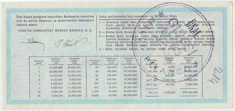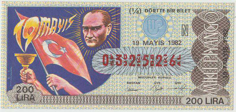 PİYANGO. 19 Mayıs 1982 tarihli millî piyango bileti. Arkası Antalya mühürlü, kondisyonu iyi. 12x5.5 cm.