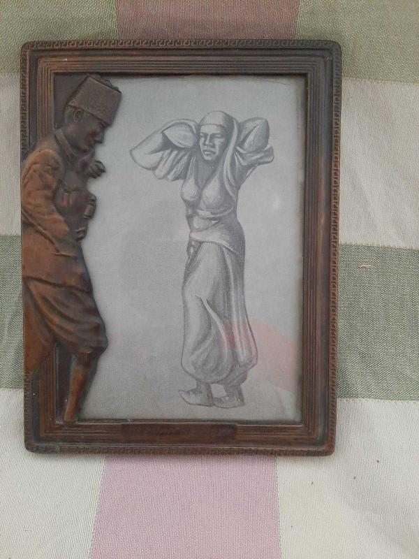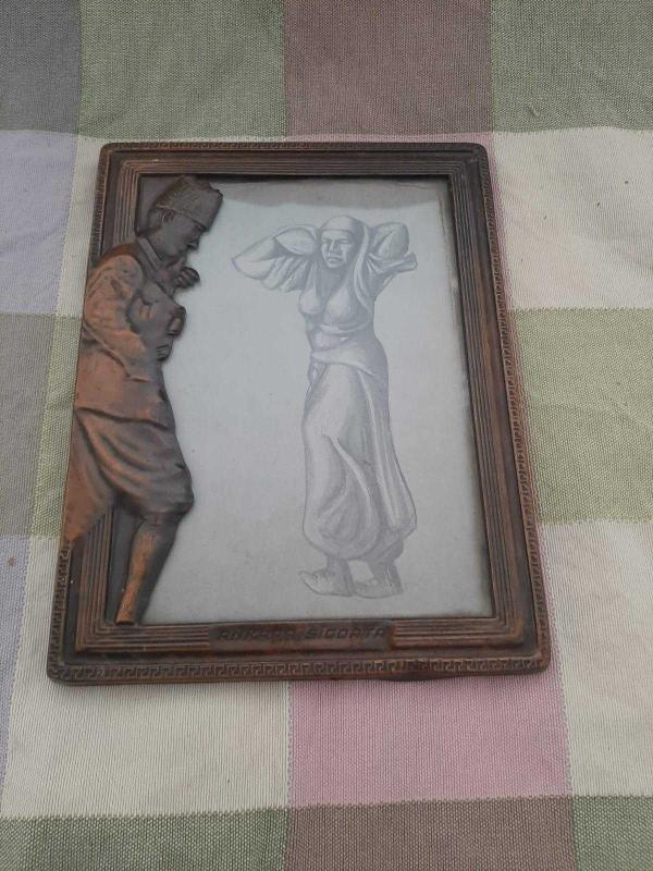 Atatürk rölyefli camlı bakır çerçevedir. Dönemi 60-70 li yıllara uzanır. Resim kara kalem çalışmadır. Bir sigorta şirketi için özel yapılmış koleksiyonluk fonksiyonel bir çerçevedir.