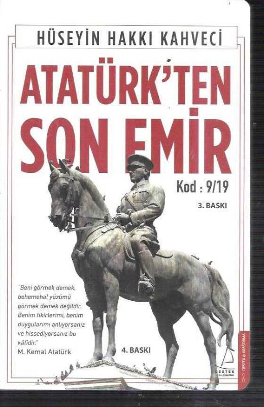 Atatürk'ten Son Emir kod: 9/19, Hüseyin Hakkı Kahveci tarafından kaleme alınmıştır. Kitap 2022 yılında Destek Yayınları tarafından [İstanbul] yayınlanmıştır. 248 sayfadır. Sayfa bilgisi 2. hamur olarak belirtilmiştir. Atatürk'ten Son Emir kod: 9/19 adlı eser Türkçe dilindedir.