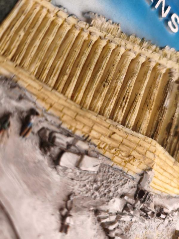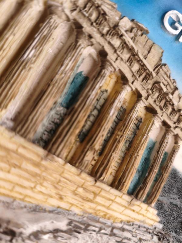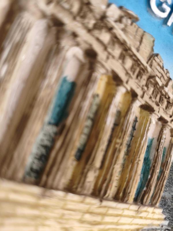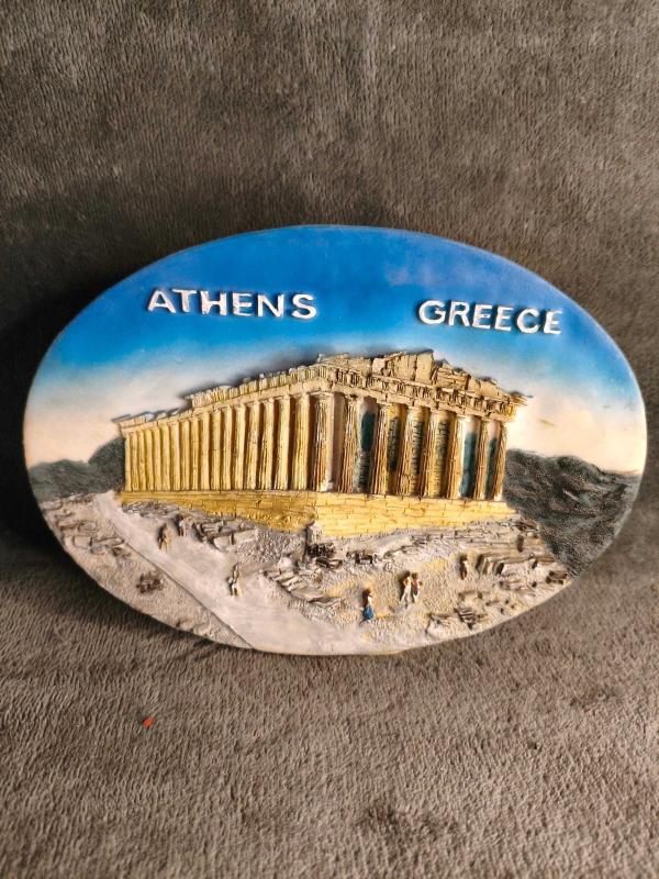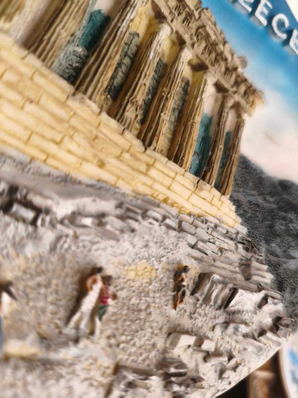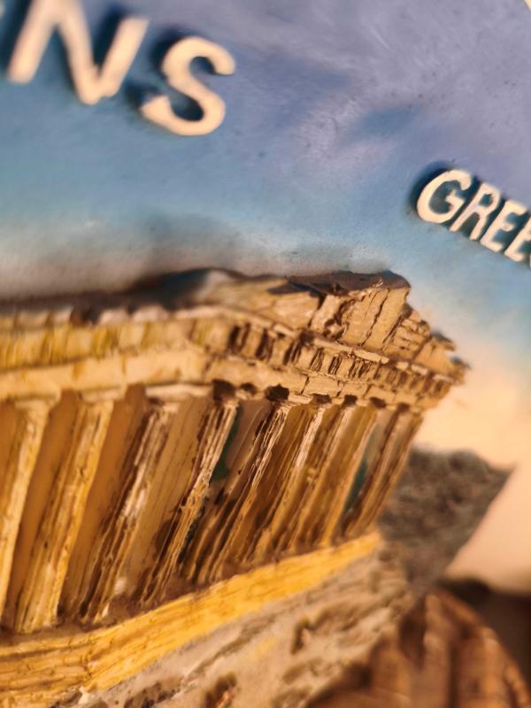 Bu özel plaket, antik Yunan medeniyetinin sembolü olan Parthenon Tapınağı'nı üç boyutlu bir sanat eseri olarak sunuyor. Döküm tekniğiyle üretilmiş bu kabartma, Yunanistan'ın Atina şehrinin görkemli tarihini ve mimarisini ustalıkla canlandırıyor. Sanatsal detaylar, tapınağın sütunlarının eskimiş dokusunu, çevresindeki kalıntıları ve hatta minik insan figürlerini bile gerçeğe yakın bir şekilde yansıtıyor. Bu eser, sadece bir hatıra değil, antik dünyanın ruhunu evinize taşıyan nadide bir parça.