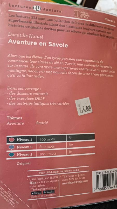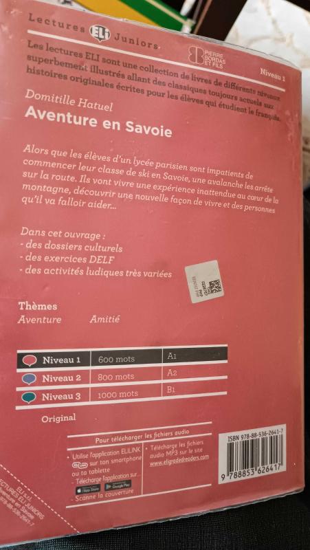 Kitap 2019 yılında Ele tarafından yayınlanmıştır. 62 sayfadır. Aventure en Savoie - Niveau 1 A1 adlı eser İtalyanca dilindedir.