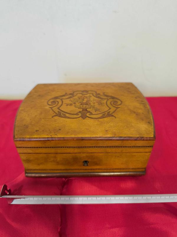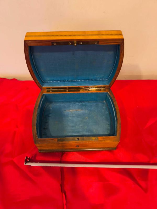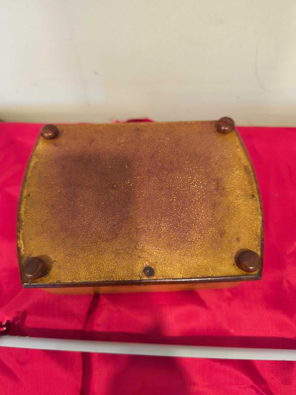 Benim favori kutum budur. Ahşabı çok özel ve kaymak gibi. Alt zemininde kibar ayakları var ve zemini deri gibi bir parça ile ahşap üstüne işlenmiş. Anahtarı yok ama kutu açılıp kapanıyor sadece kitlenmiyor anahtar uydurulabilir ya da böyle kullanılabilir. Çok iyi durumda. Bence sürpriz bir ürün.